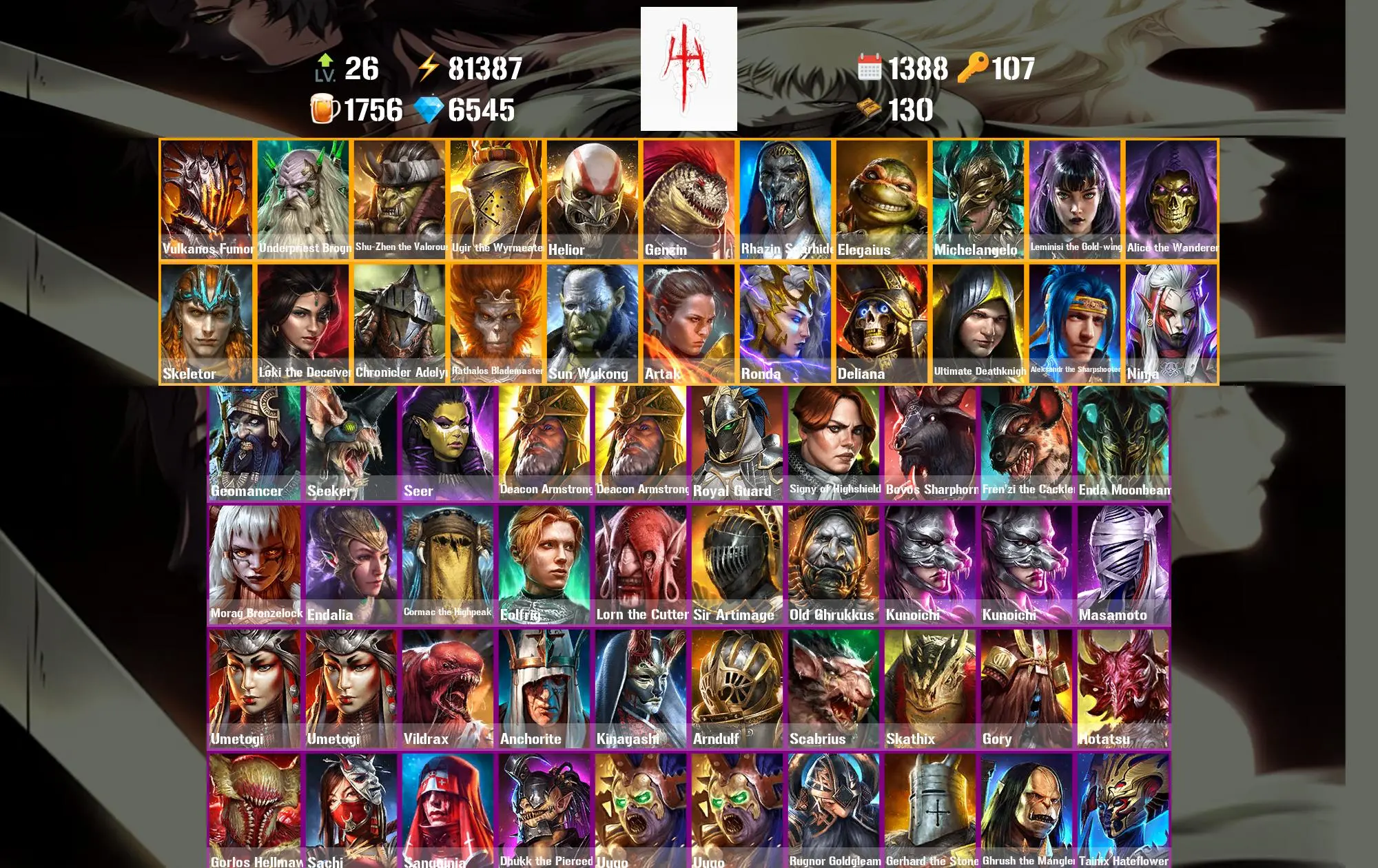 1388 Days 81.4k Energy Vulkanos Fumor ⸱ Underpriest Brogni ⸱ Shu-Zhen the Valorous ⸱ Ugir the Wyrmeater ⸱ Helior ⸱ Geomancer ⸱ Seeker ⸱ 51.0m Silver ⸱ 6.5k Gems