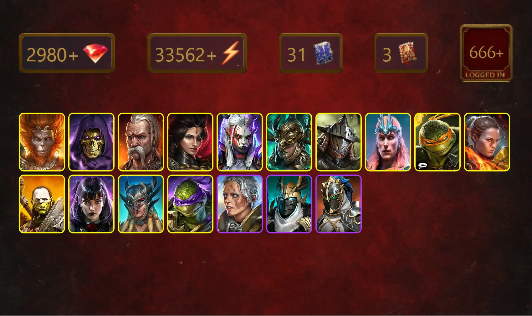 [STARTER]Taras+Donatello+Wukong+Skeletor+Adelyn+Visix+Leminisi the Gold-Wing+Rathalos+Loki+Michelangelo+Ronda+Artak+32Epics