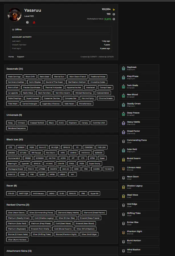 🔥【PC/Steam】 • Level 323 • 616 Skins • 34 Seasonals • 50 Black Ice • 9 Universals • 307 Legendary+Epic • 100K Renown • 701 Credits 💎 (Black Ice)