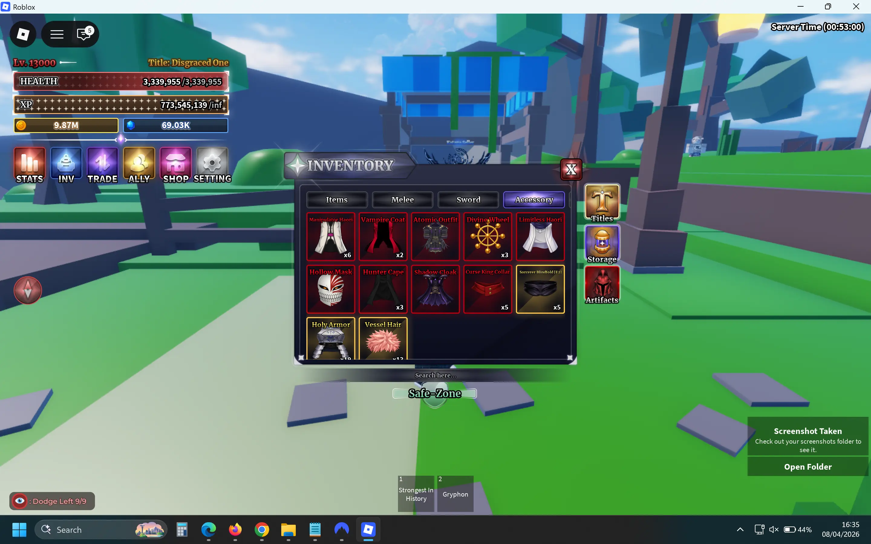[Instant] [Sailor Piece] Lv13000 | Strongest in History | Title: Disgraced One | Gryphon | Light | Sasaki | 9M Money | 69K Gems | 250K Bounty | Atomic Outfit, Aura Crate and more