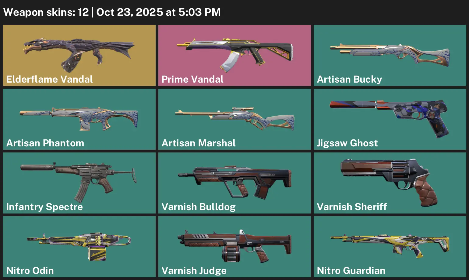 🛕 AP 🦝 Unranked 🌷 12 Skins 🌨 91 VP 🖌 14 Agents 🍋 Value: 5125 VP ☁️ Elderflame Vandal 🐝 Prime Vandal 🪤 Artisan Bucky 🌴 Artisan Phantom 🔎 Artisan Marshal 🍨 Jigsaw Ghost