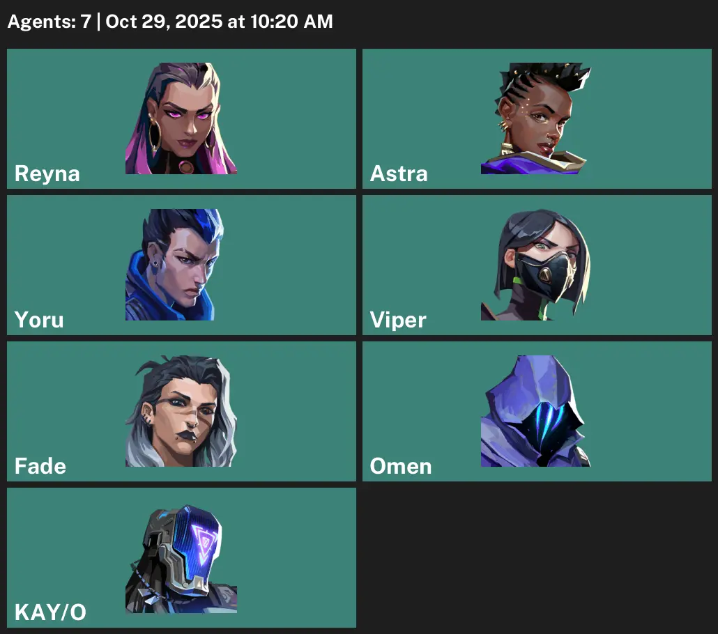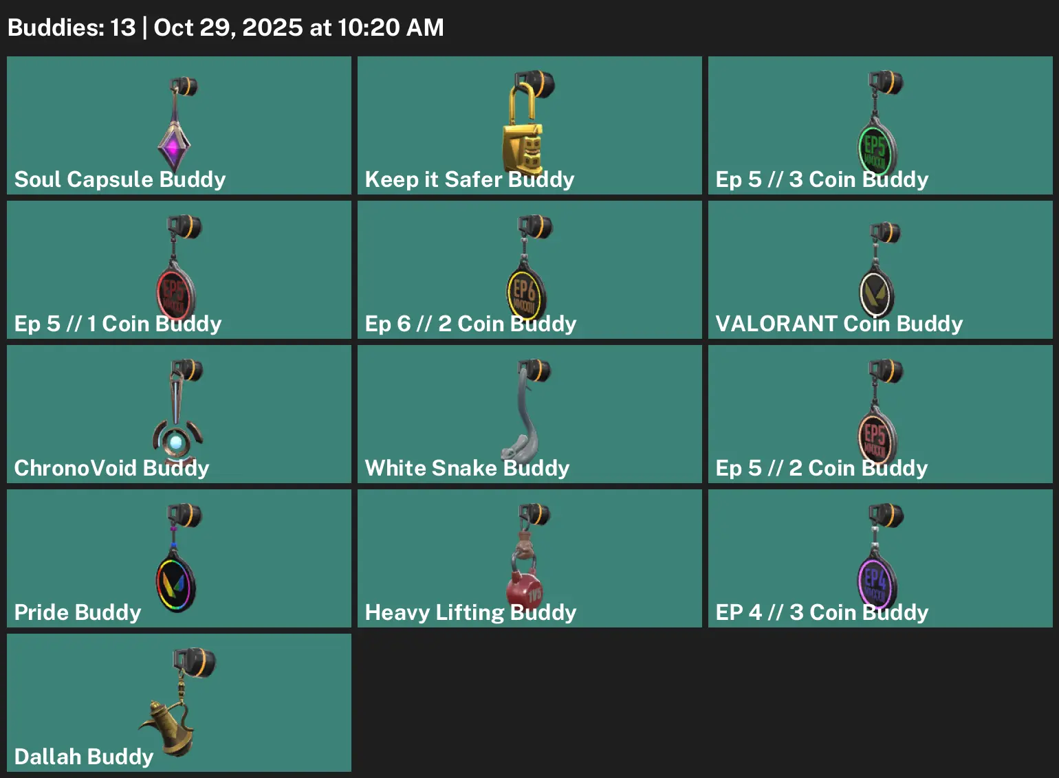 🫖 AP 🏌️♂️ Unranked 🛞 5 Skins 🥯 275 VP 🏹 7 Agents 🎀 Value: 13050 VP 🫰 ChronoVoid Judge 🍶 ChronoVoid Sheriff 🕹 ChronoVoid Phantom 🐐 Terminus A Quo 🩴 ChronoVoid Vandal