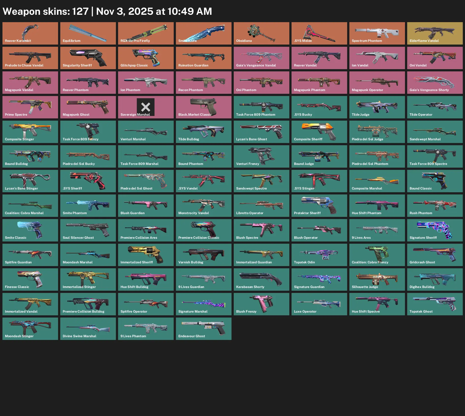 🦄 BR 🌷 Unranked 🪣 127 Skins 🧇 270 VP 🌏 19 Agents 🌝 Value: 60500 VP 🤓 Reaver Karambit 🐪 Equilibrium 🧂 RGX 11z Pro Firefly 🫱 Smite Knife 🍰 Obsidiana 📌 .SYS Melee