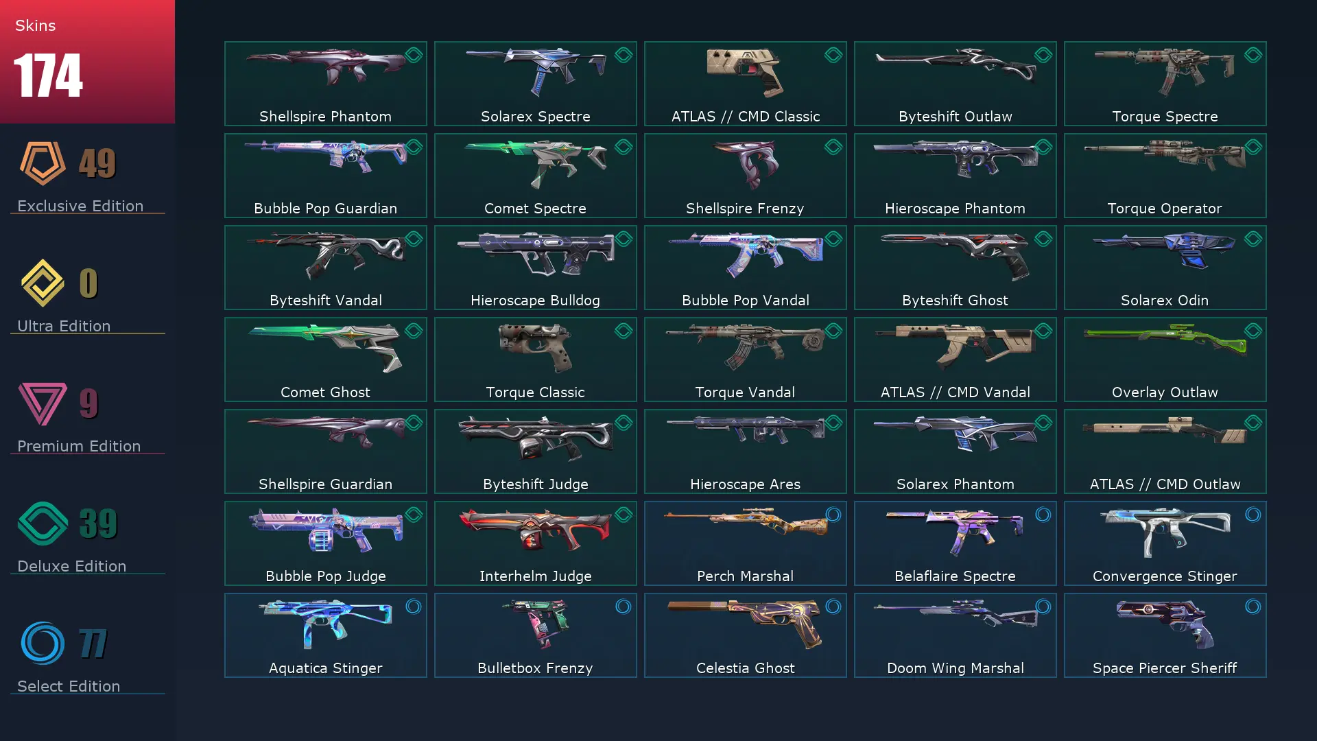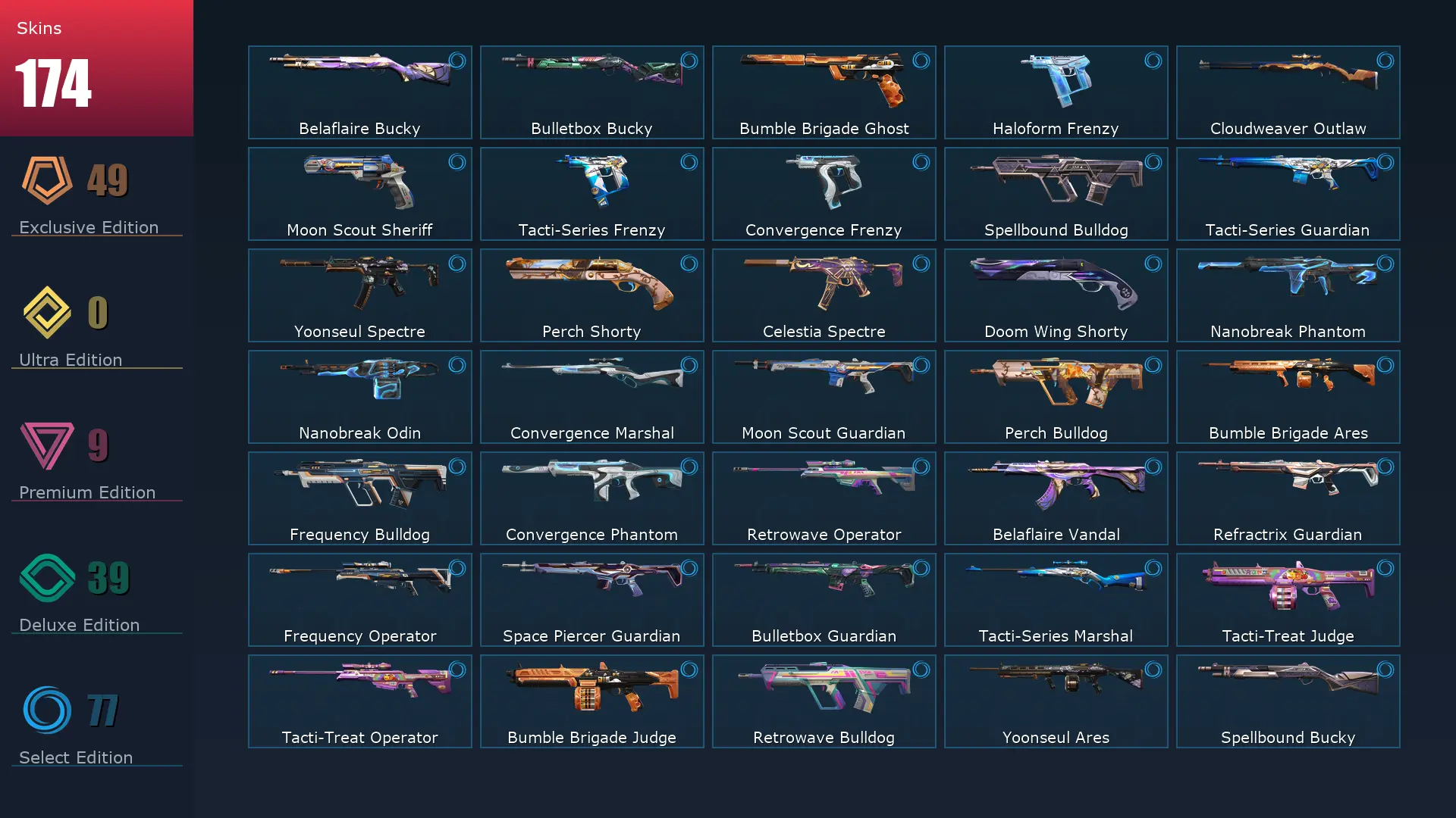 EU ✏️ 174 Skins 🧘♂️ 27 Agents 🧽 164 Level 🎤 Arcane Vandal 🏗 Arcane Gauntlets 🚵 CYRAX Guardian 🦣 Gaia's Vengeance Ghost 🚏 Mystbloom Kunai Mystbloom Phantom 🍮 Prime Vandal ✨ Nocturnum Classic 🤮 Divergence Operator 🪂 Mystbloom Sheriff