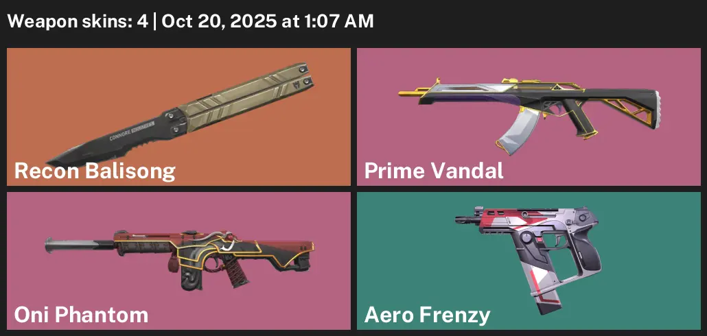🎊 LA 🐵 Unranked 🕊 4 Skins 🚤 272 VP 🏌️♂️ 11 Agents 🧆 Value: 7100 VP 🌒 Recon Balisong 💌 Prime Vandal 🛞 Oni Phantom 😶🌫️ Aero Frenzy