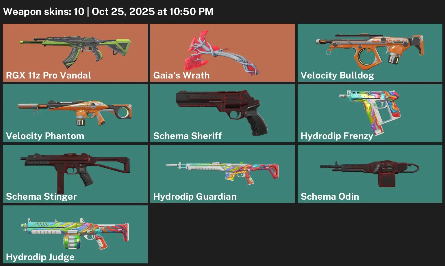 🛰 NA 🕸 Unranked 🏋️♂️ 10 Skins 🧦 176 VP 🧲 9 Agents 🎖 Value: 5725 VP 📇 RGX 11z Pro Vandal 🪅 Gaia's Wrath 🔩 Velocity Bulldog 🛒 Velocity Phantom 🦧 Schema Sheriff 😈 Hydrodip Frenzy