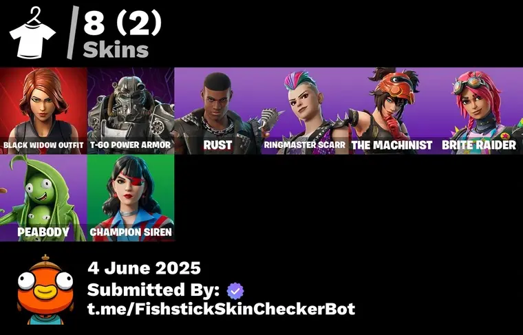 【PC/PSN/XBOX】8 Skins | Black Widow Outfit | T-60 Power Armor | Rust | Ringmaster Scarr | The Machinist | Brite Raider | Peabody | Champion Siren | 0 VB | FS36