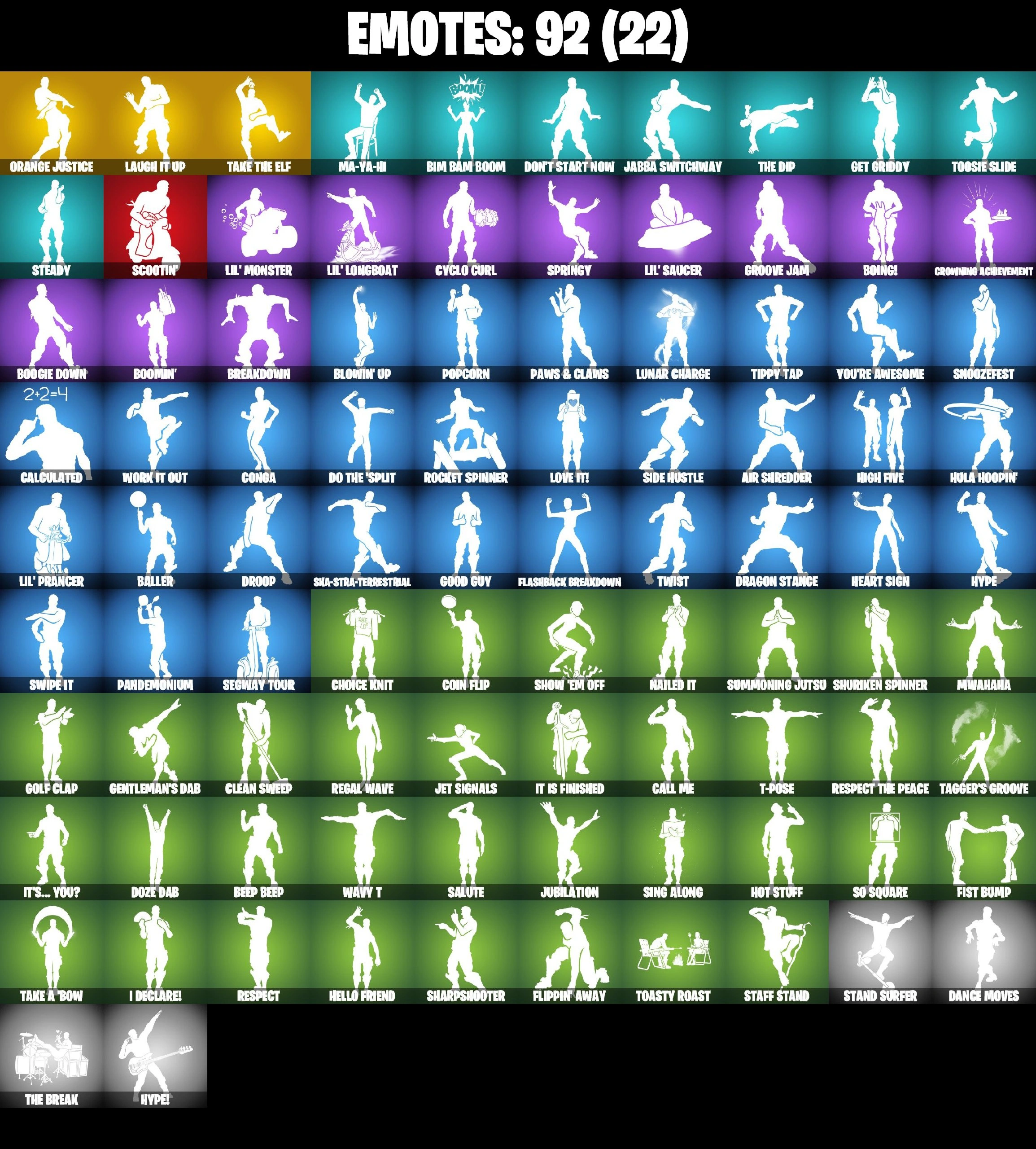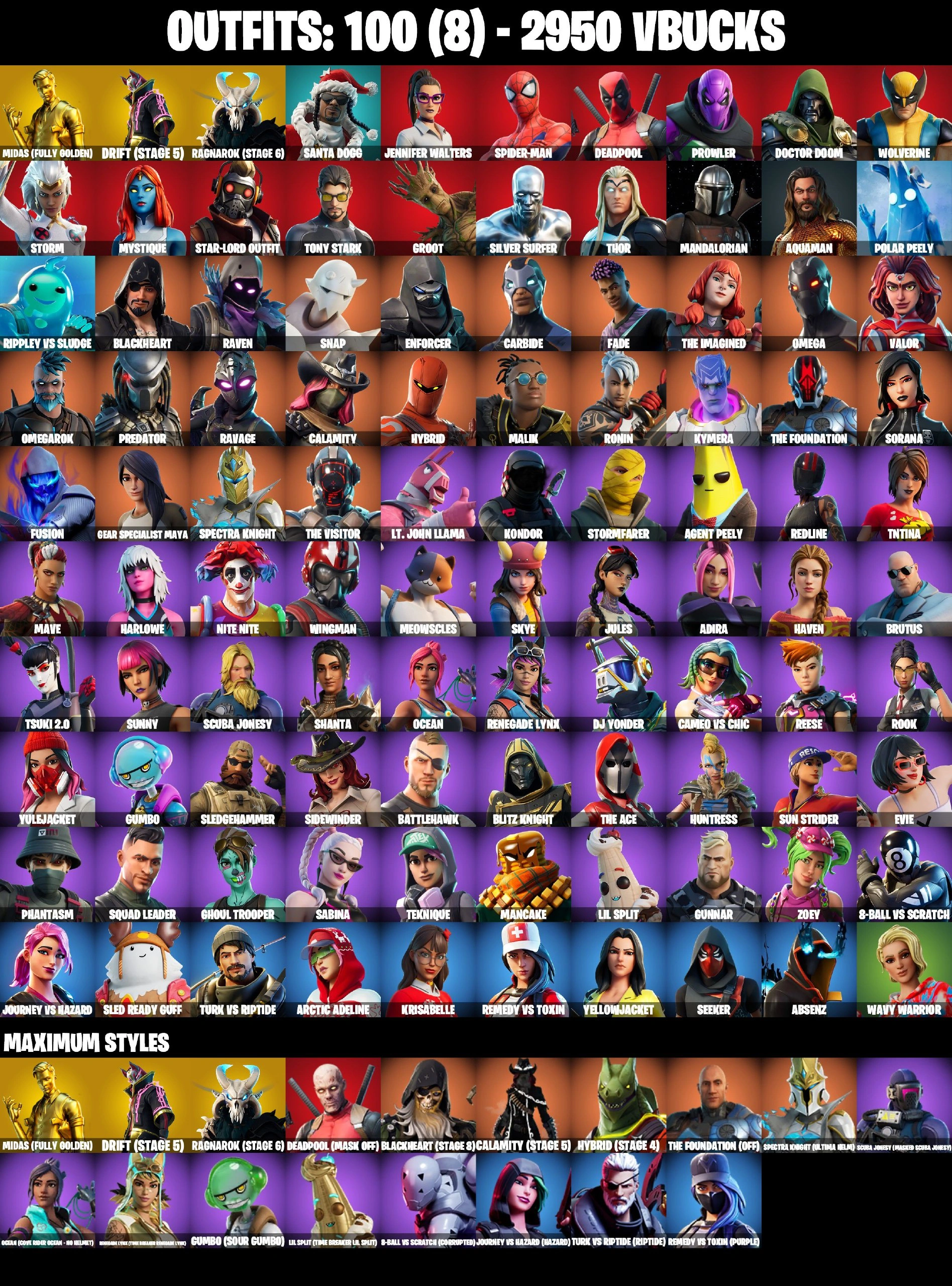 100 SKINS ⸱ LAUGH IT UP ⸱ OMEGA ⸱ SPIDER-MAN ⸱ GHOUL TROOPER ⸱ NITE NITE ⸱ SORANA ⸱ CARBIDE ⸱ RAVEN ⸱ DEADPOOL ⸱ DRIFT MAXED ⸱ AGENT PEELY ⸱ CALAMITY ⸱ EVIE ⸱ MAYA ⸱ SILVER SURFER ⸱ POLAR PEELY ⸱ TAKE THE ELF ⸱ ORANGE JUSTICE ⸱ JA