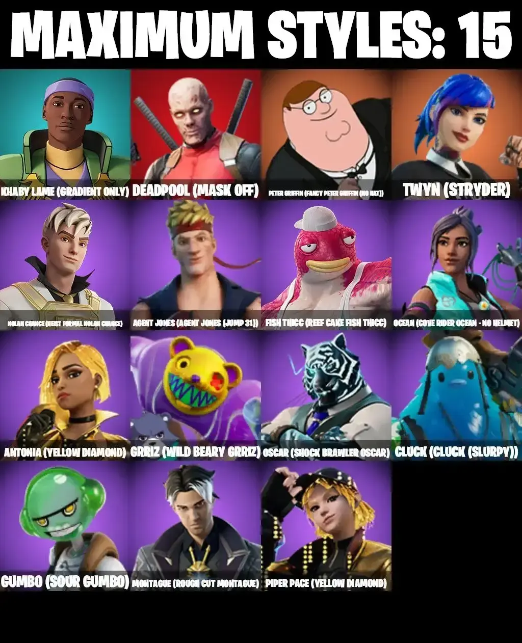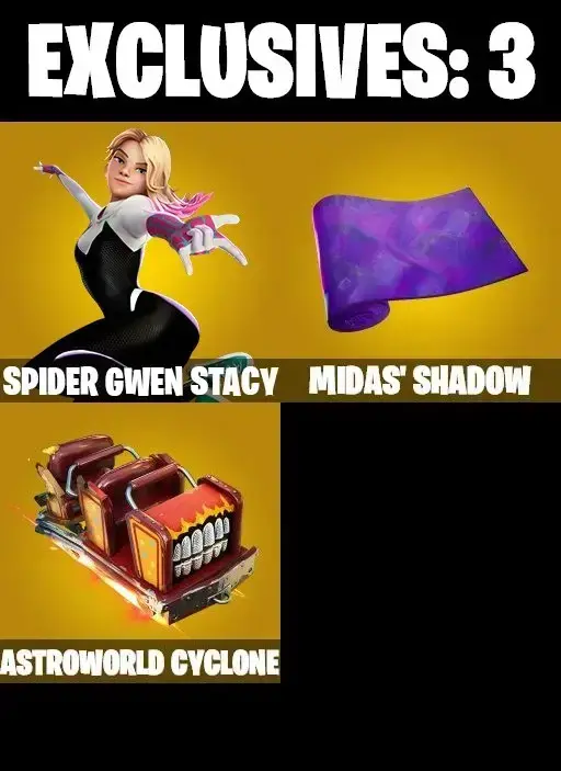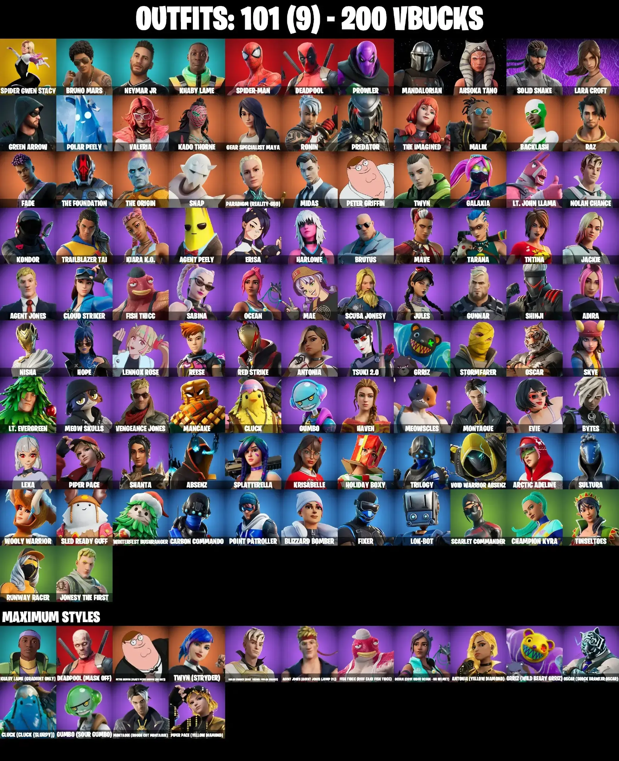 101 SKINS | BACKLASH | GET GRIDDY | SPIDER-GWEN STACY | SPIDER-MAN | MANDALORIAN | AHSOKA TANO | LARA CROFT | INTRODUCING | WINDMILL FLOSS | GALAXIA | PREDATOR | TSUKI 2.0 | EVIE | MEOW SKULLS | AGENT PEELY | SCARLET COMMANDER | A