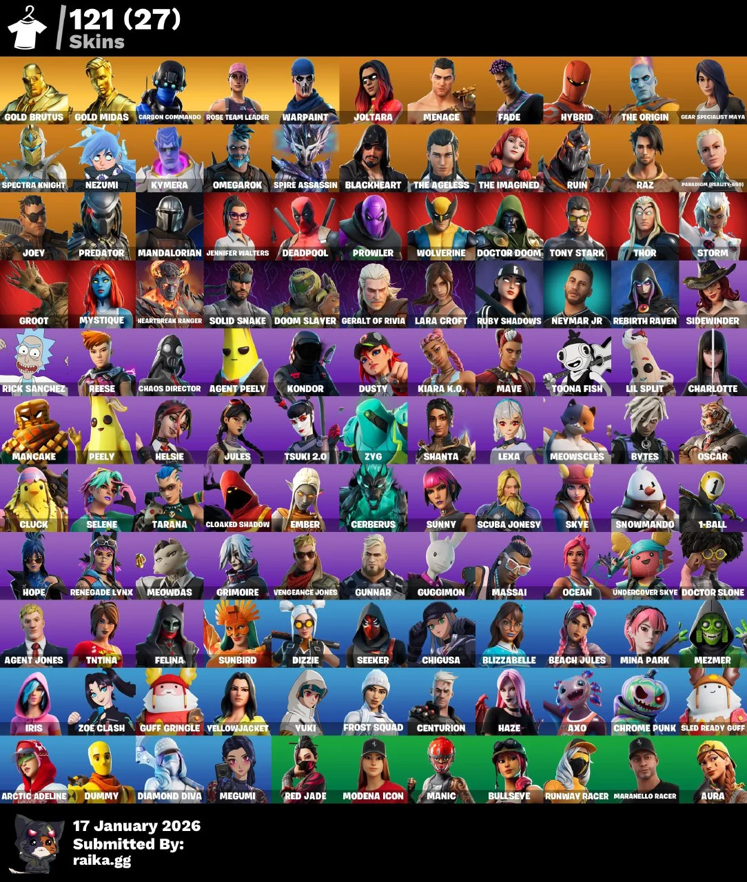 121 skins OG STW ๐ Gold Brutus ๐ Gold Midas ๐ฐ Carbon Commando โก Joltara ๐ Menace ๐ Fade ๐ Hybrid ๐ฅ The Origin ๐ Gear Specialist Maya ๐ฏ 0 VB ๐ 24/7 support ๐ง Anti ban ๐ก๏ธ [ PC/ Xbox / Ps ] ๐