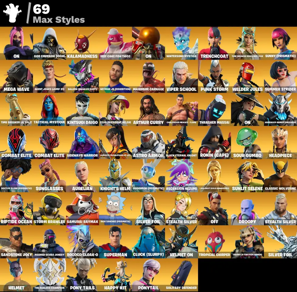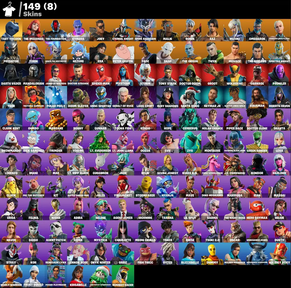149 skins βΈ± For all platforms, 1400 VB, Tart Tycoon | Lara Croft Gold | The Imagined | The Foundation | Kymera | Joey | Eternal Knight | Spire Assassin | Malik | Ronin | Raz | Mizuki