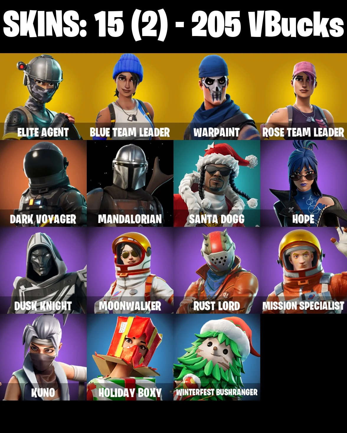 🎆15 SKINS ⚡️PC/XBOX⚡️ ELITE AGENT 👑 BLUE TEAM LEADER 👑 DARK VOYAGER 👑 MANDALORIAN 👑 SANTA DOGG 👑 HOPE 👑 BLITZ KNIGHT 👑 MOONWALKER ⚡️ 205 VB #M492