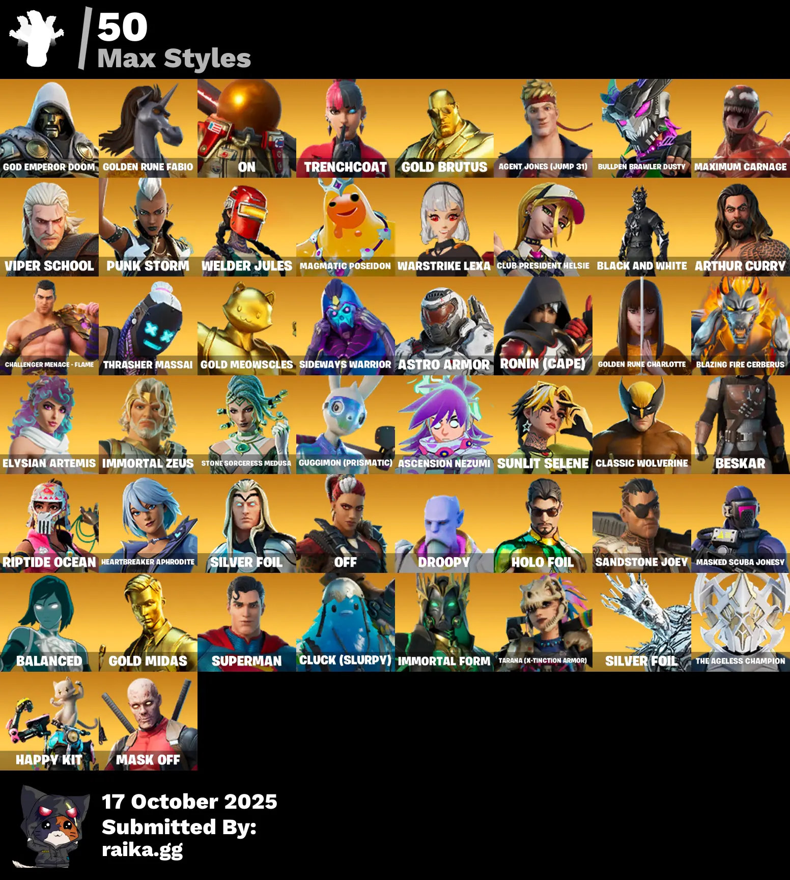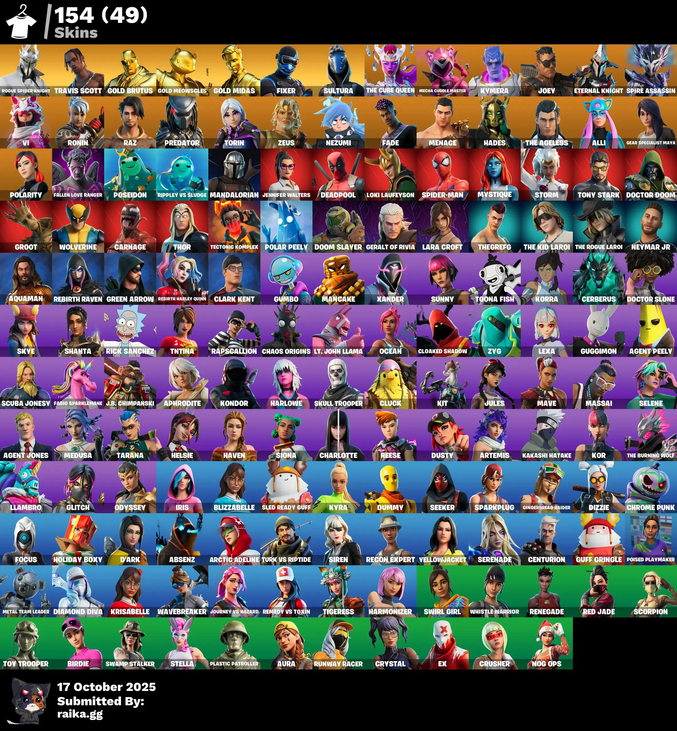 154 skins | Travis Scott🐔Fixer🐔Menace🐔Sultura🐔Torin🐔Joey🐔Ronin🐔The Ageless🐔Mecha Cuddle Master🐔Gold Meowscles🐔Hades🐔Nezumi🐔Raz🐔Spire Assassin🐔Fade🐔Eternal Knight🐔Zeus🐔Gold Midas🐔Kymera🐔Rogue Spider Knight🐔Vi🐔The Cube Queen D5134