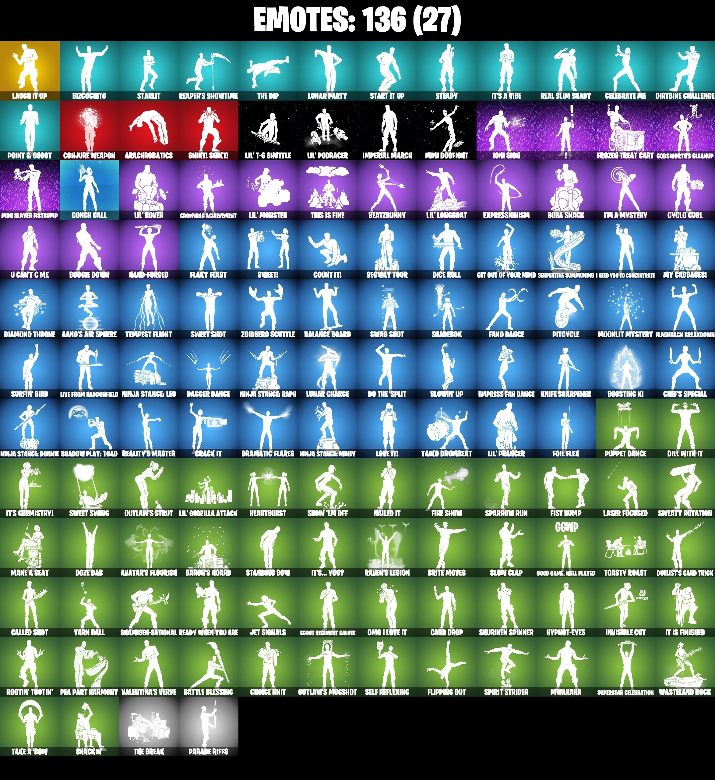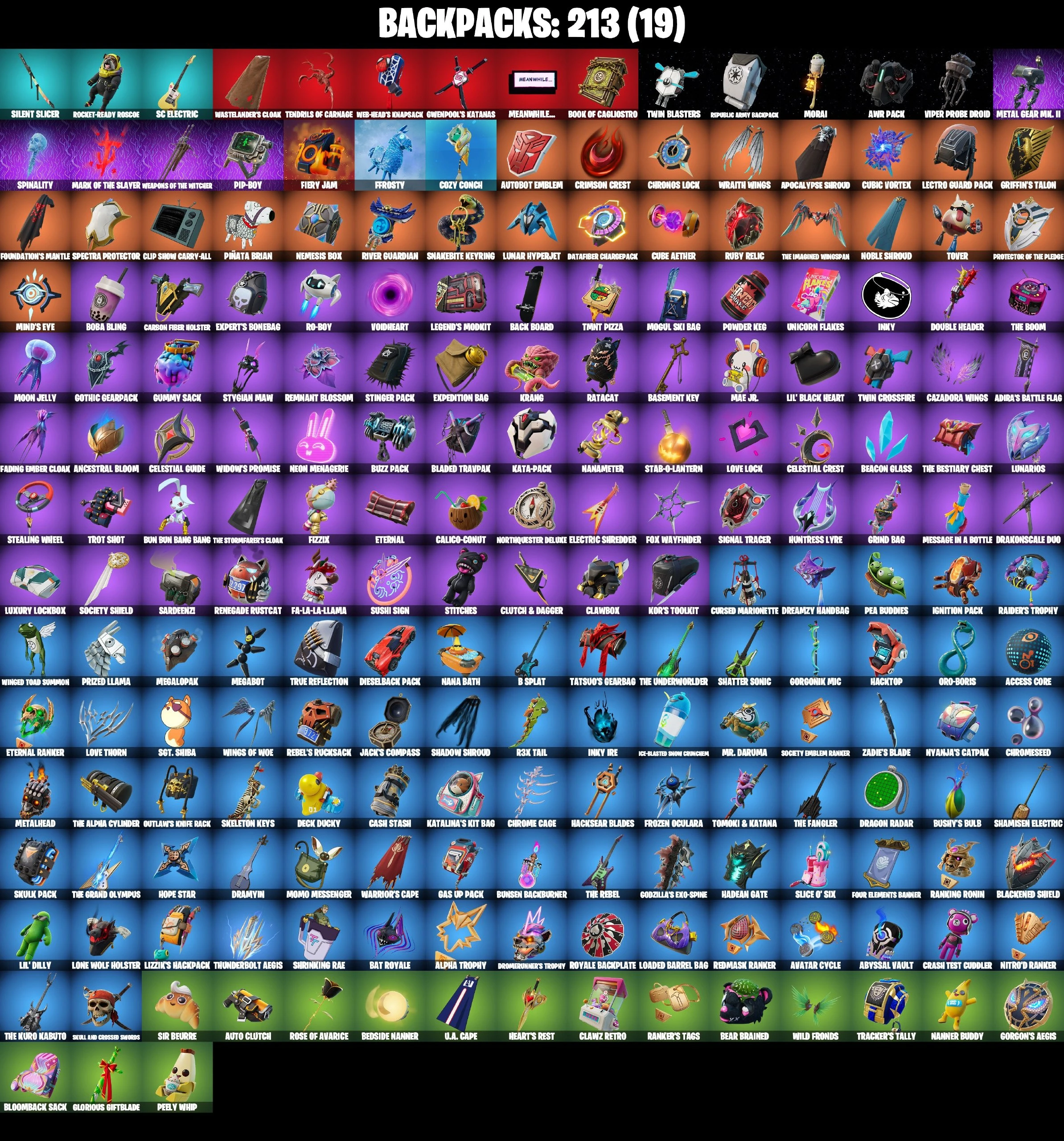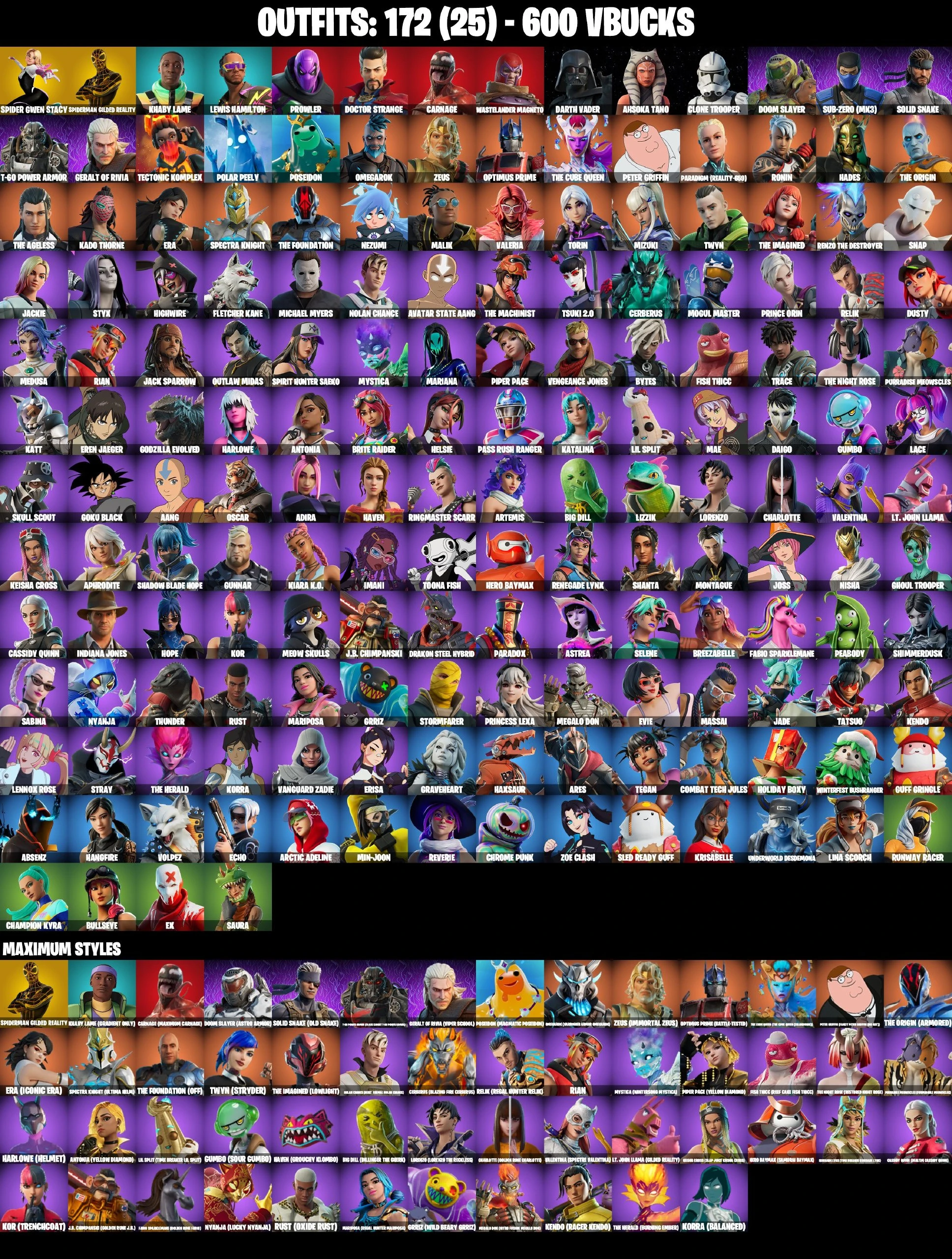 172 SKINS ⸱ LAUGH IT UP ⸱ SPIDER-MAN MAXED ⸱ SPIDER-GWEN STACY ⸱ PRINCESS LEXA ⸱ IMANI ⸱ MICHAEL MYERS ⸱ SPIRIT HUNTER SAEKO ⸱ AANG ⸱ MARIANA ⸱ STYX ⸱ GHOUL TROOPER ⸱ PARADOX ⸱ JACK SPARROW ⸱ GRAVEHEART ⸱ ZOE CLASH ⸱ VOLPEZ ⸱ HANG