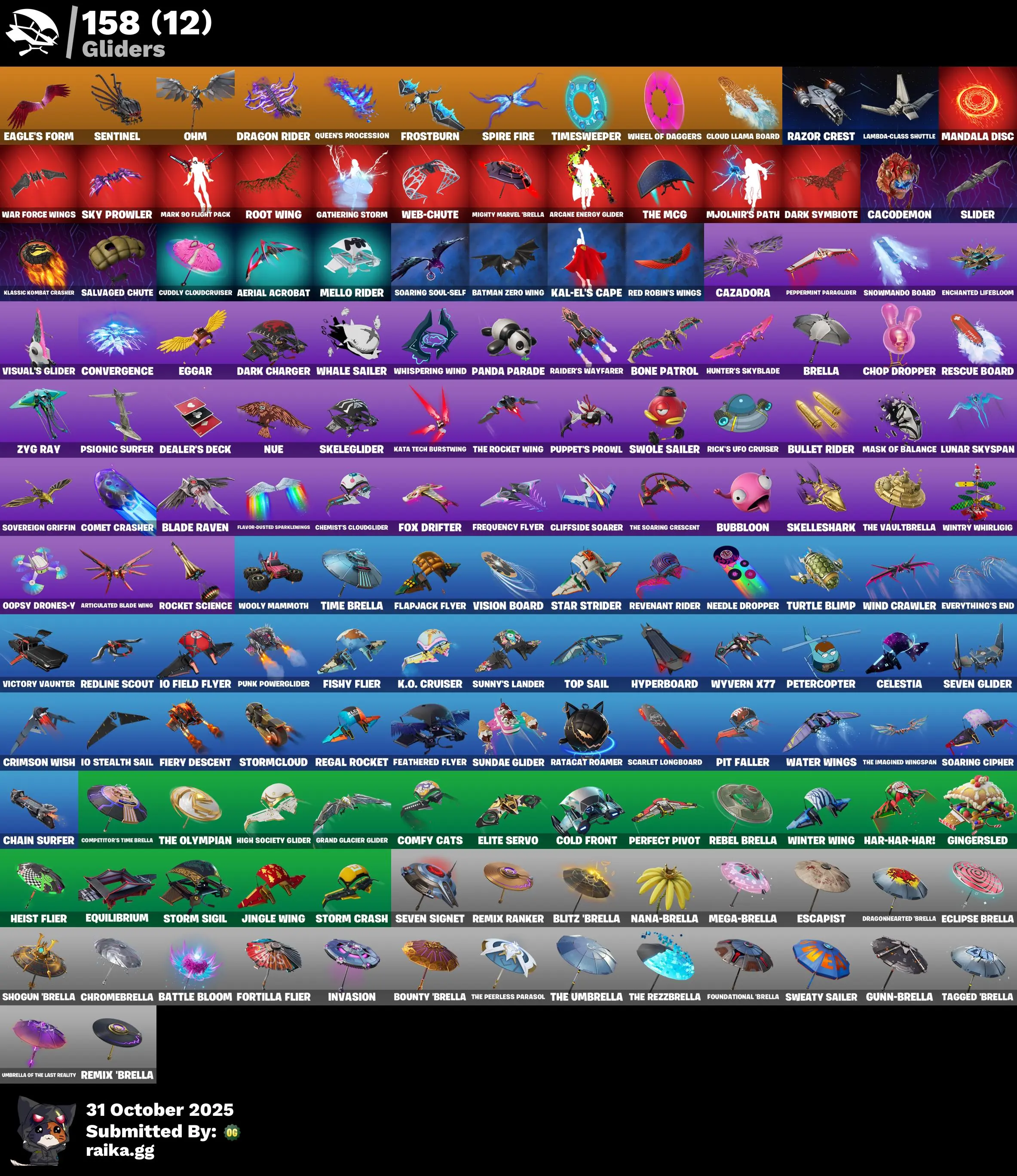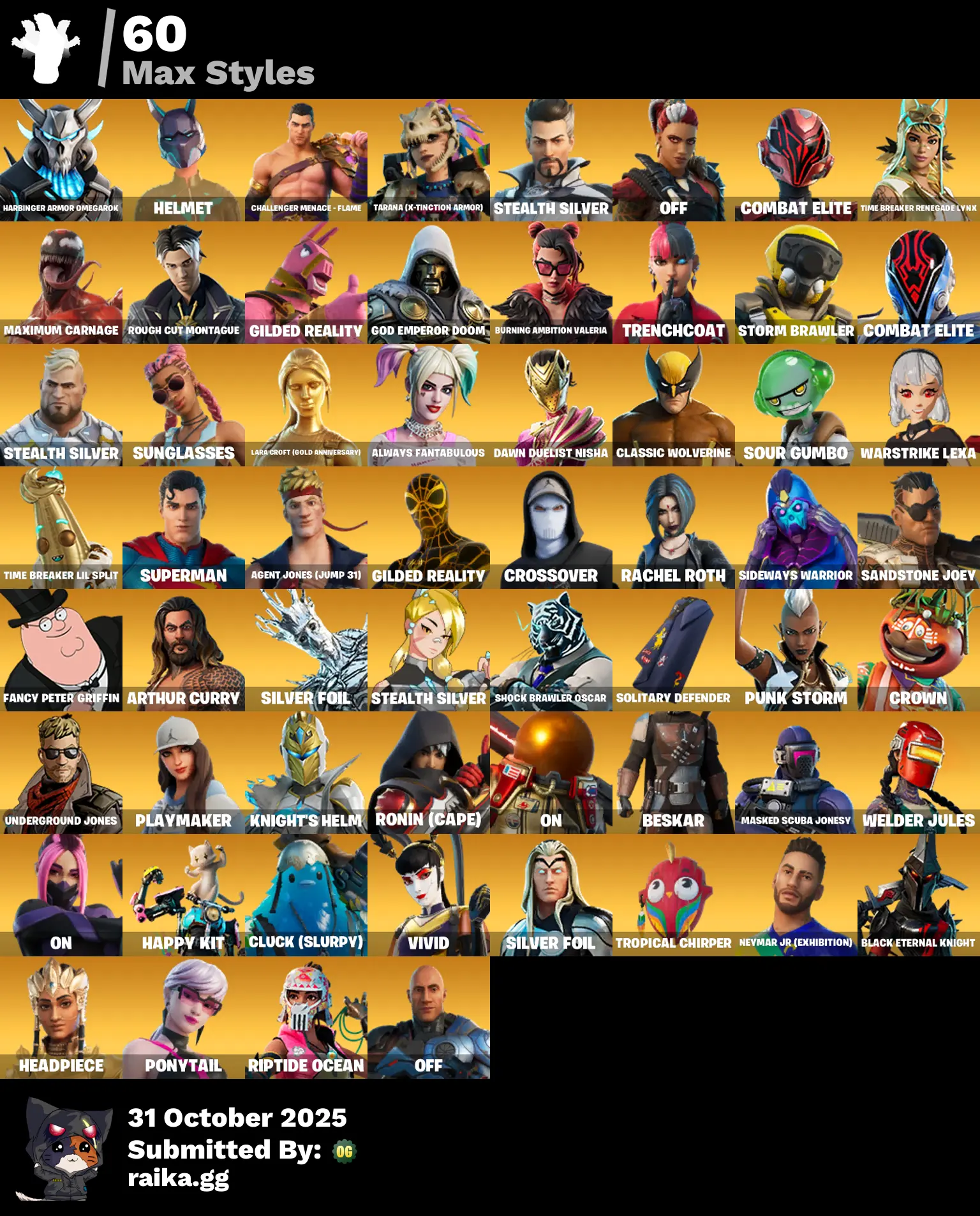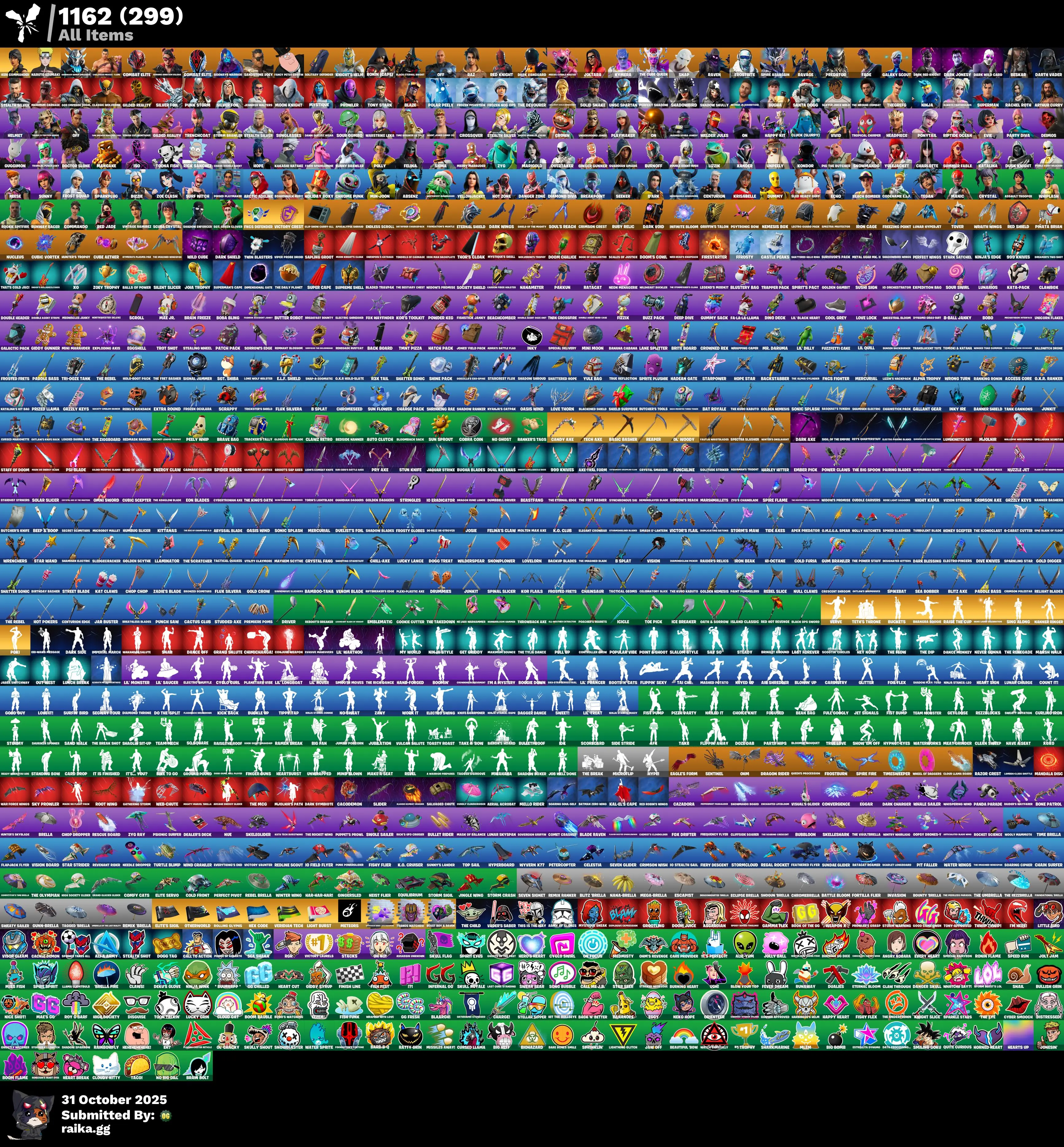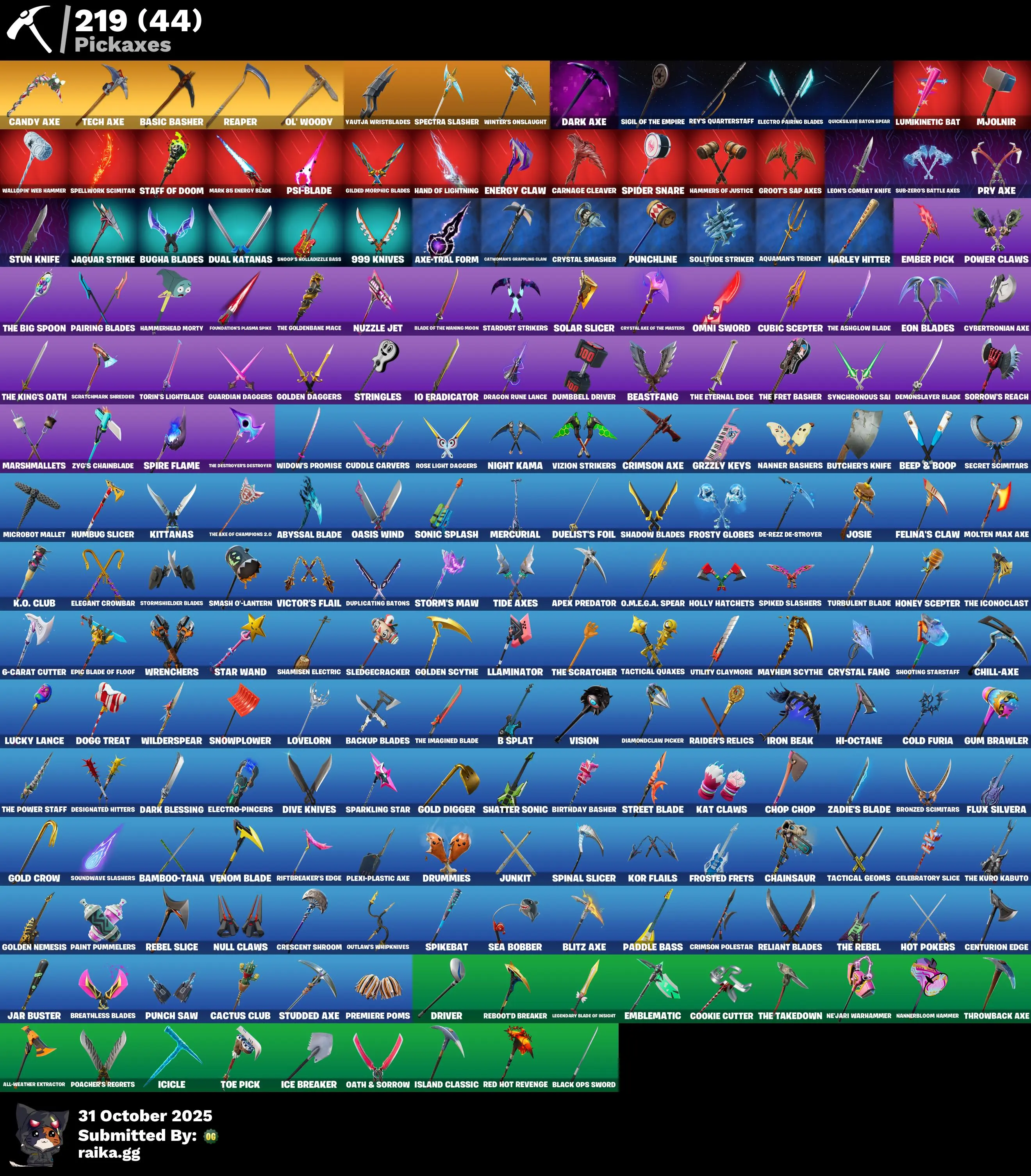 183 skins | Kakashi Hatake🎃Naruto Uzumaki🎃Candy Axe🎃Get Griddy🎃Spider-Man🎃Harley Quinn🎃Lara Croft🎃Merry Marauder🎃Jules🎃Ginger Gunner🎃The Break🎃Lil' Longboat🎃Epic Blade of Floof🎃Hi-Octane🎃Double Agent Wildcard🎃The Dip🎃Icicle D5274