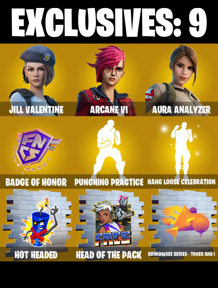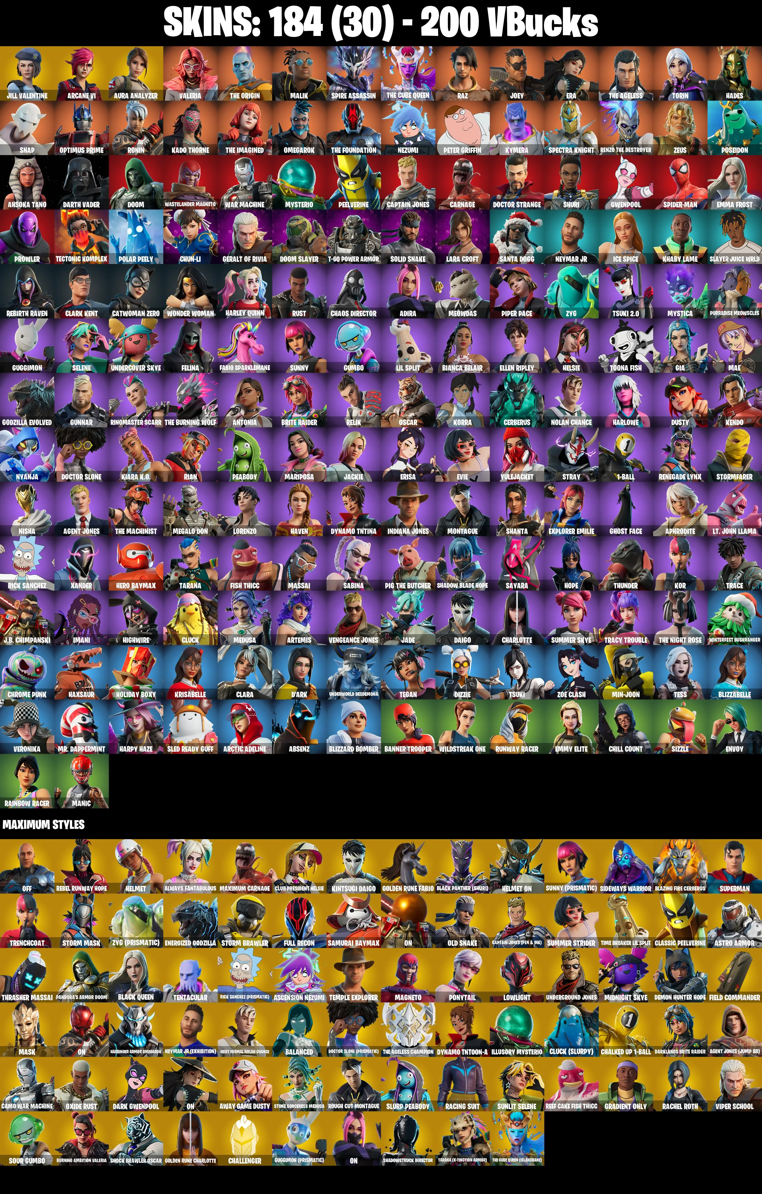 184 SKINS ✨ Jill Valentine ✨ Arcane Vi ✨ Aura Analyzer ✨ Valeria ✨ The Origin ✨ Malik ✨ Spire Assassin ✨ The Cube Queen ✨ 200 V-Bucks (PC)