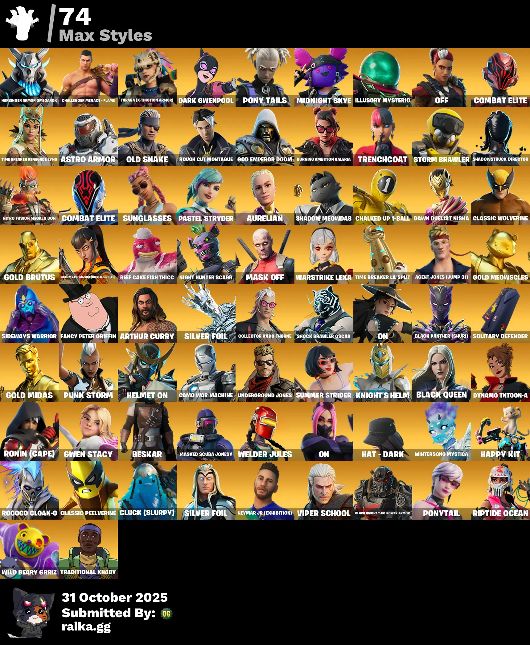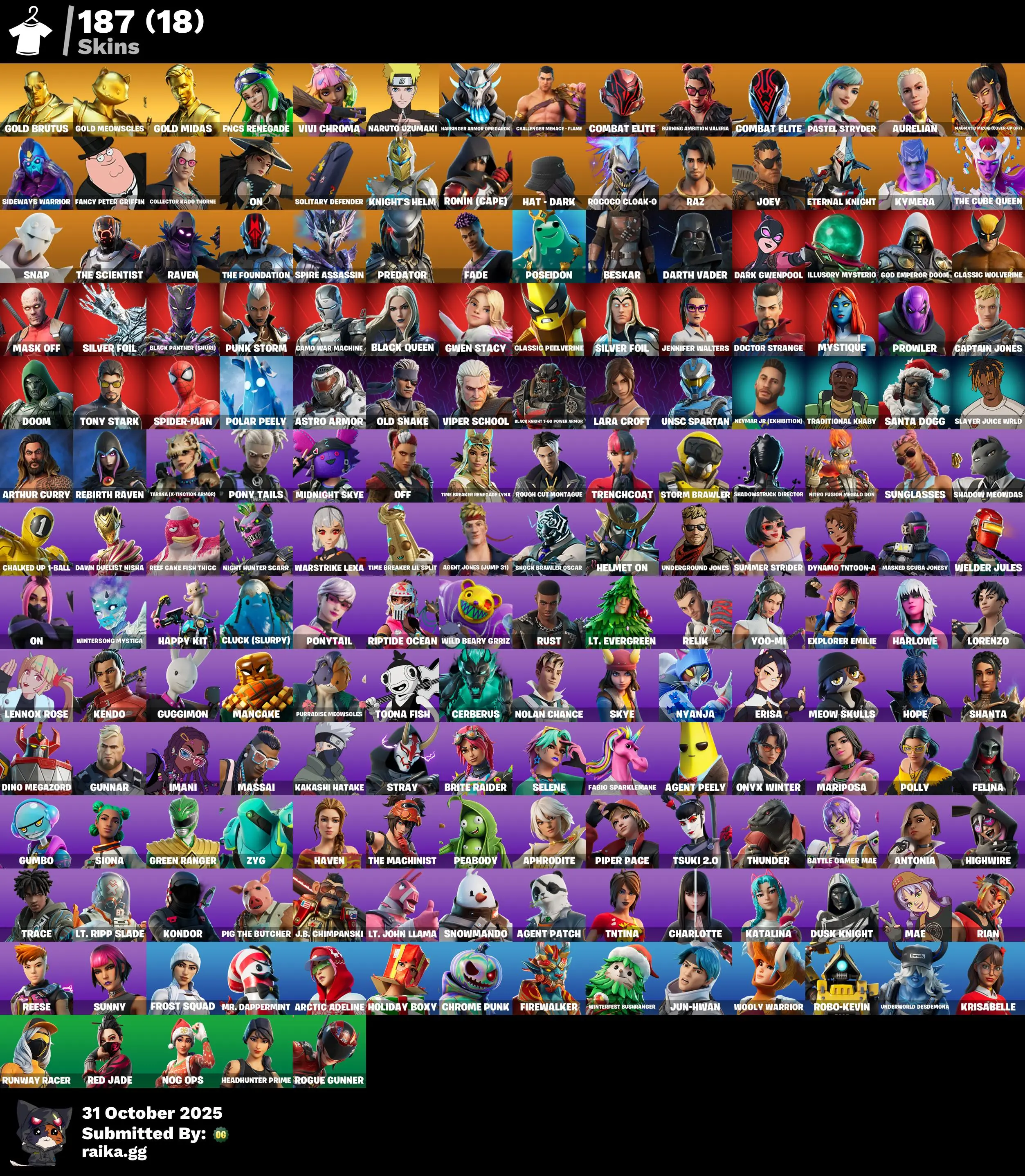 187 skins | Kakashi Hatake🎃Naruto Uzumaki🎃Gold Midas🎃Lara Croft🎃Spider-Man🎃Take The Elf🎃Spider-Gwen🎃Jules🎃Mobile Megalodon🎃Nog Ops🎃The Machinist🎃Kondor🎃Rian🎃Katalina🎃Lil Split🎃Krisabelle🎃Tsuki 2.0🎃Blitz Knight🎃Oscar🎃Lt. Ripp Slade D5282