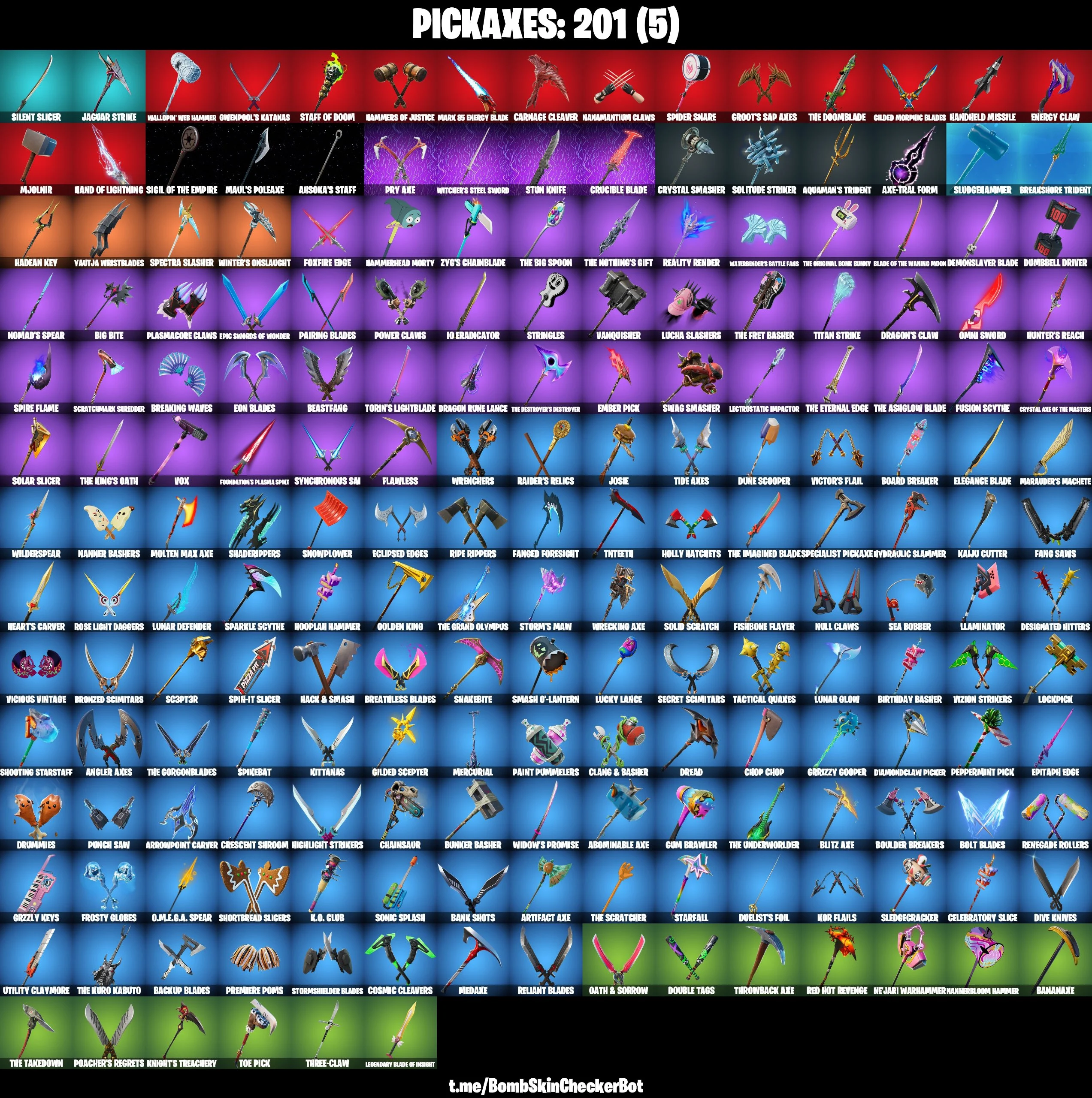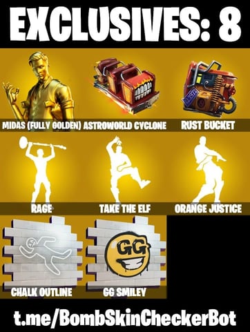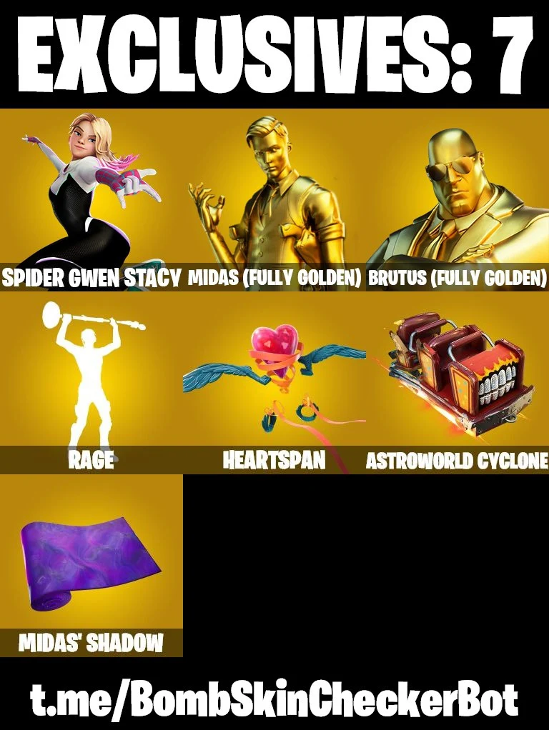 🔮189 Skins🔮 Spidergwen (Stacy)💎Rage💎Midas (Fully Golden)💎Tony Stark💎Darth Vader💎Lara Croft💎Neymar Jr💎Tilted Teknique💎Luxe💎Peely💎Jules💎Clark Kent💎Polar Peely💎Krisabelle💎Rick Sanchez💎Ember💎Predator💎Toona Fish💎Meow Skulls💎Khaby Lame💎Spiderman💎
