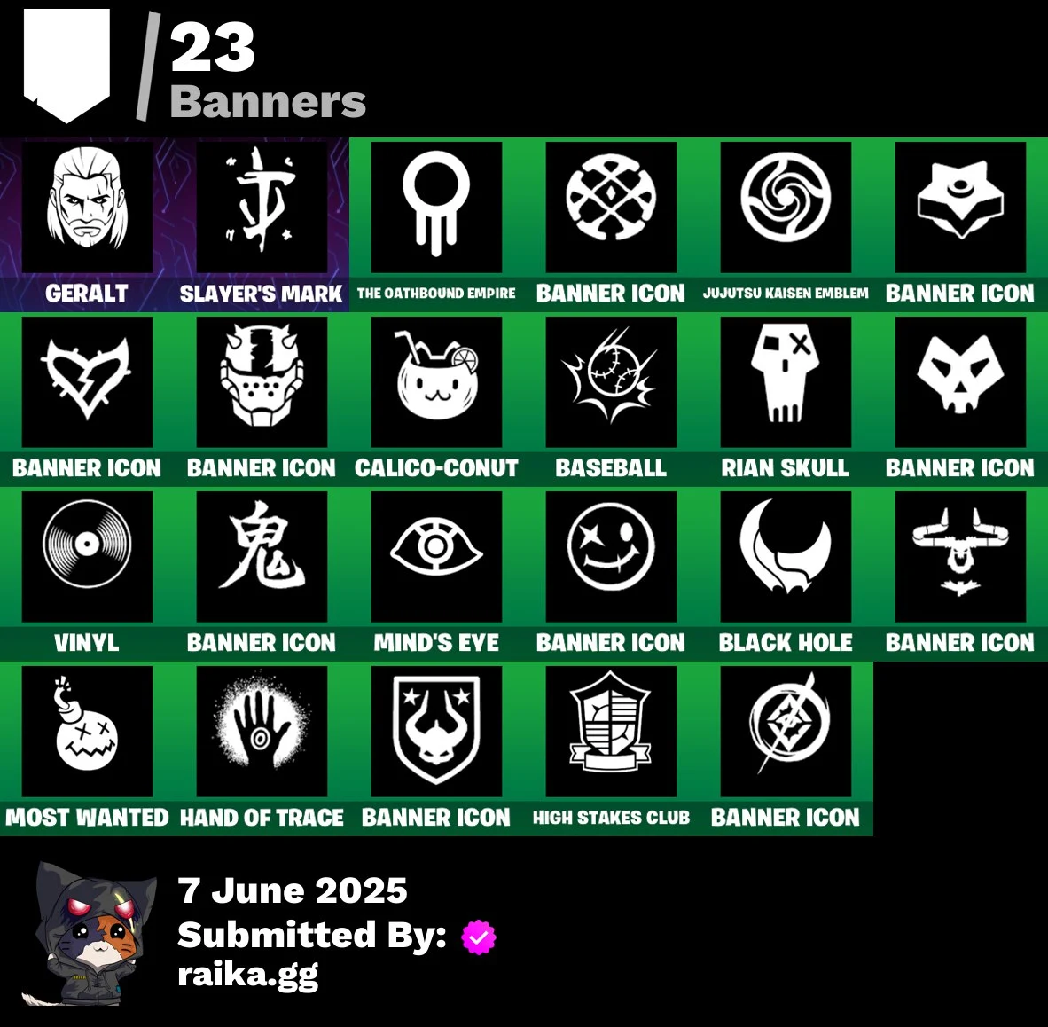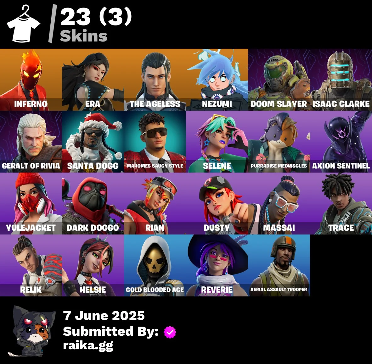 23 skins | Aerial Assault Trooper | Inferno | Era | The Ageless | Nezumi | Doom Slayer | Isaac Clarke | Geralt of Rivia | Santa Dogg | 350 VB