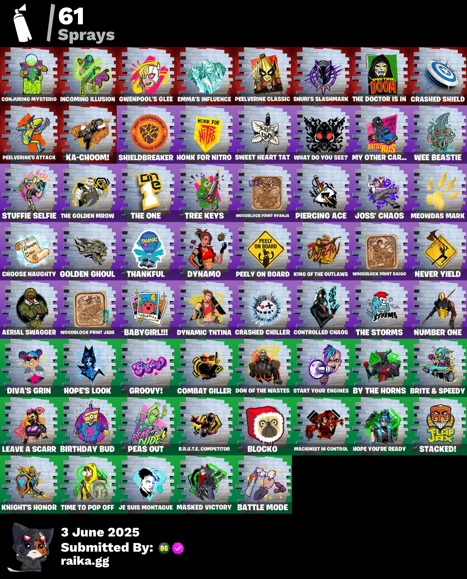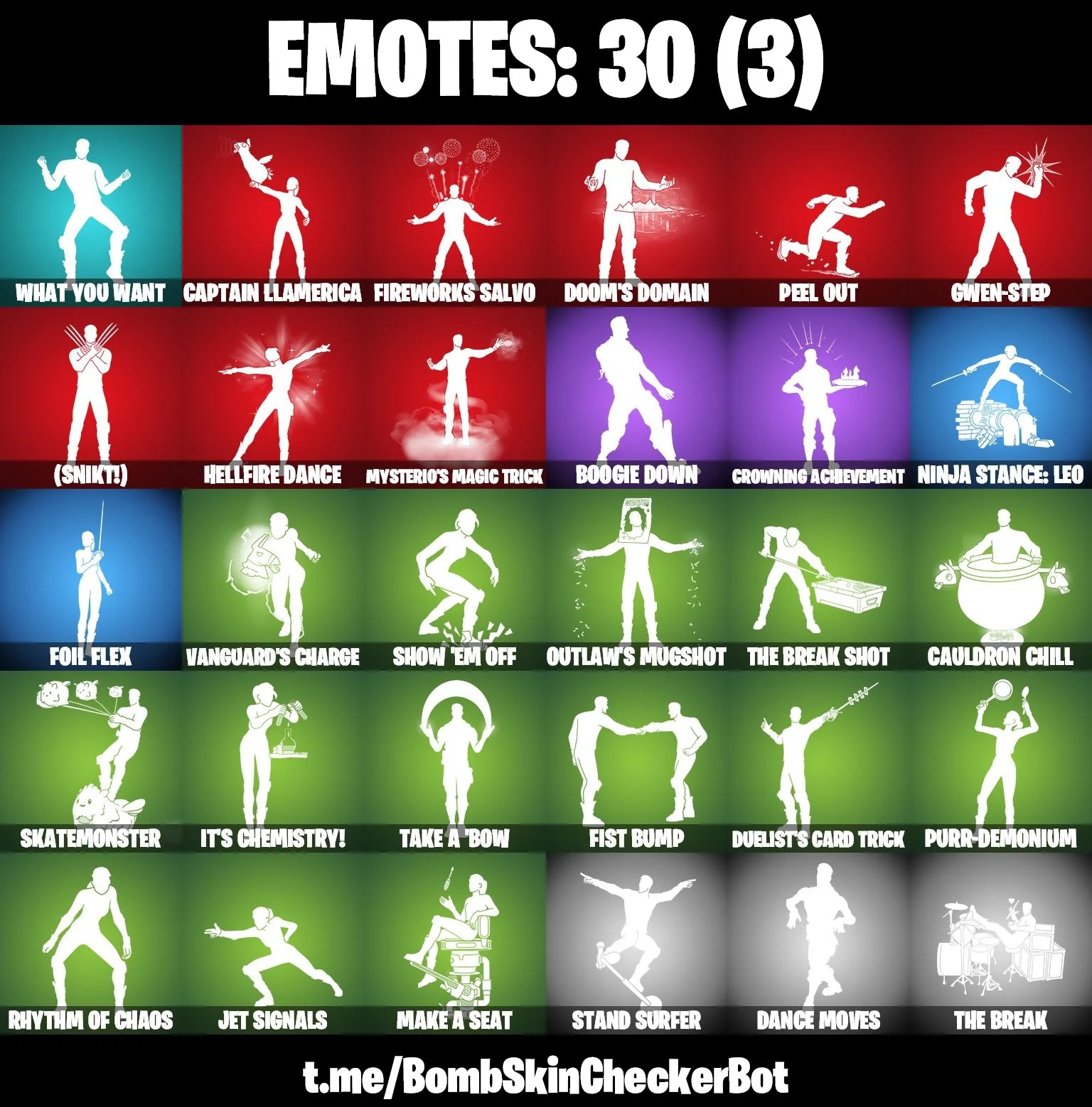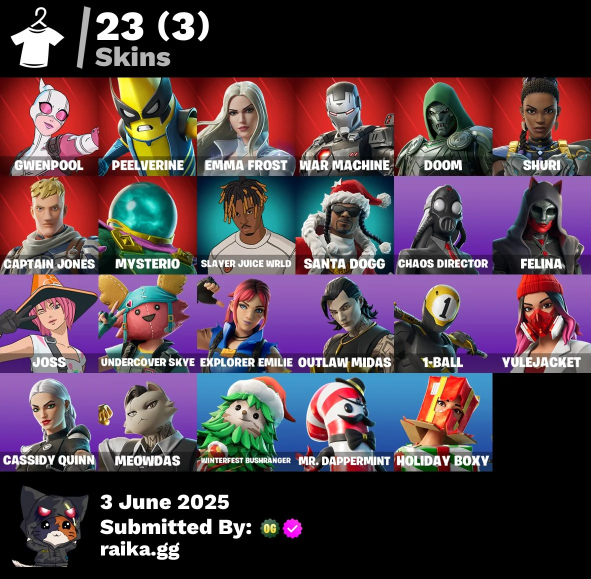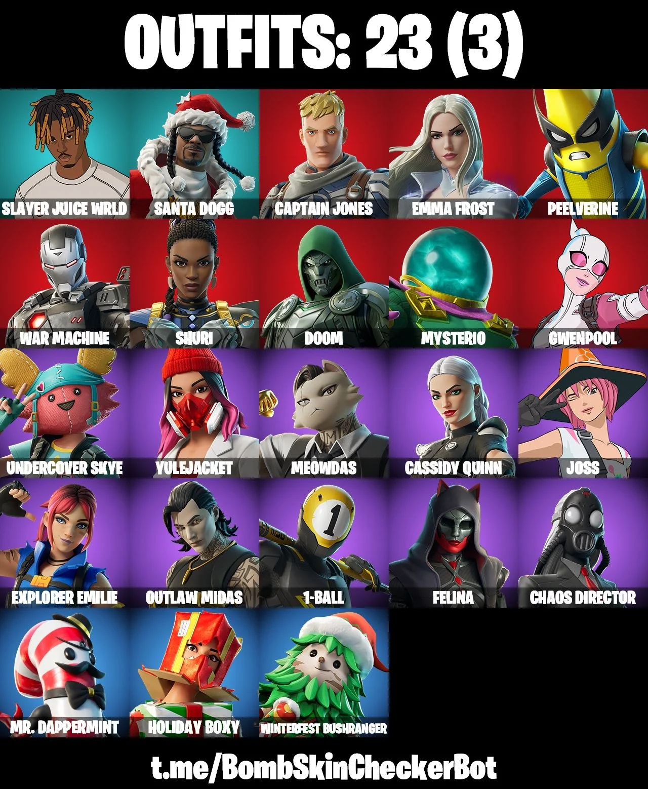 23 skins | Gwenpool | Peelverine | Emma Frost | War Machine | Doom | Shuri | Captain Jones | Mysterio | Slayer Juice WRLD | Santa Dogg | 400 VB | Nai@1