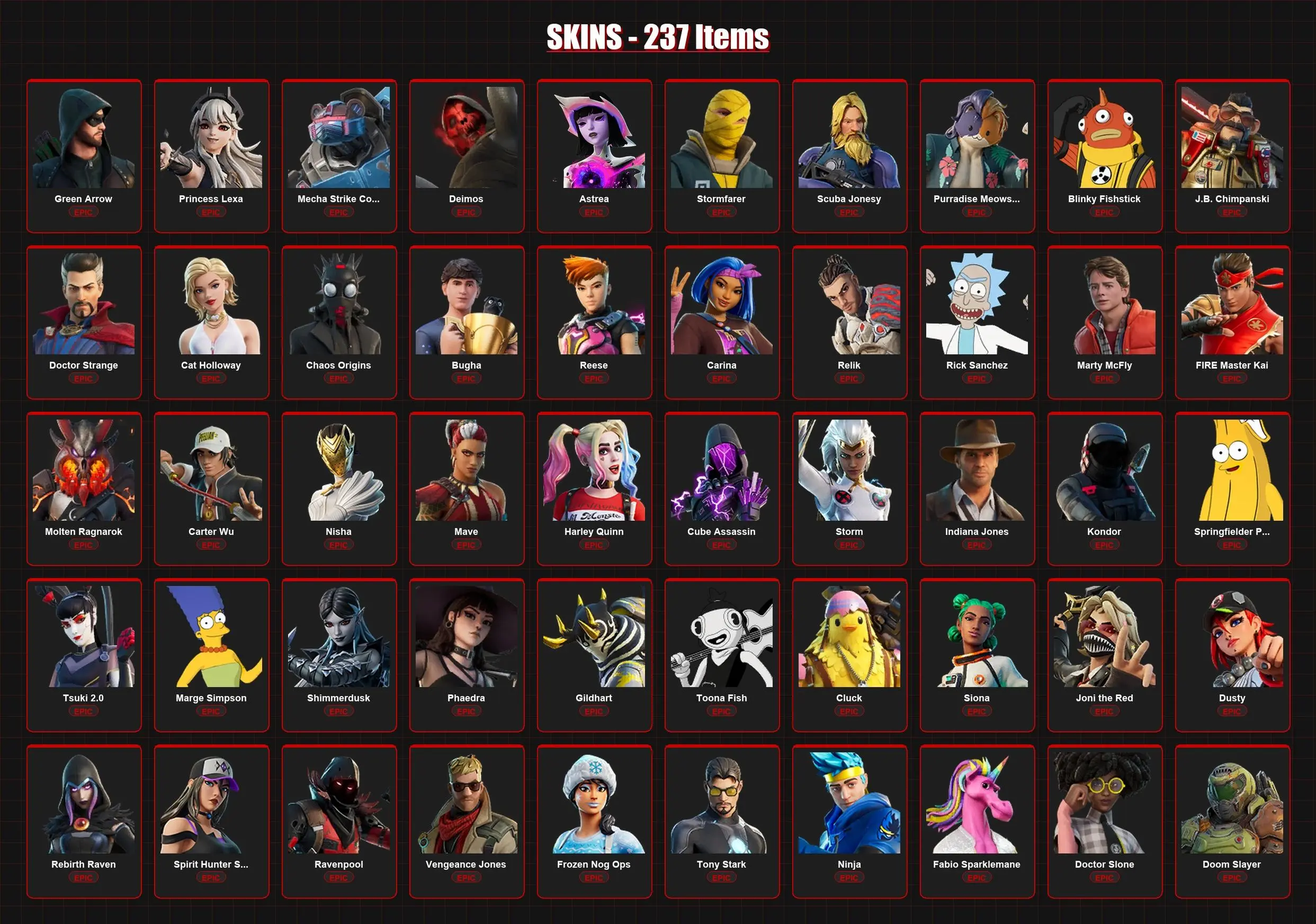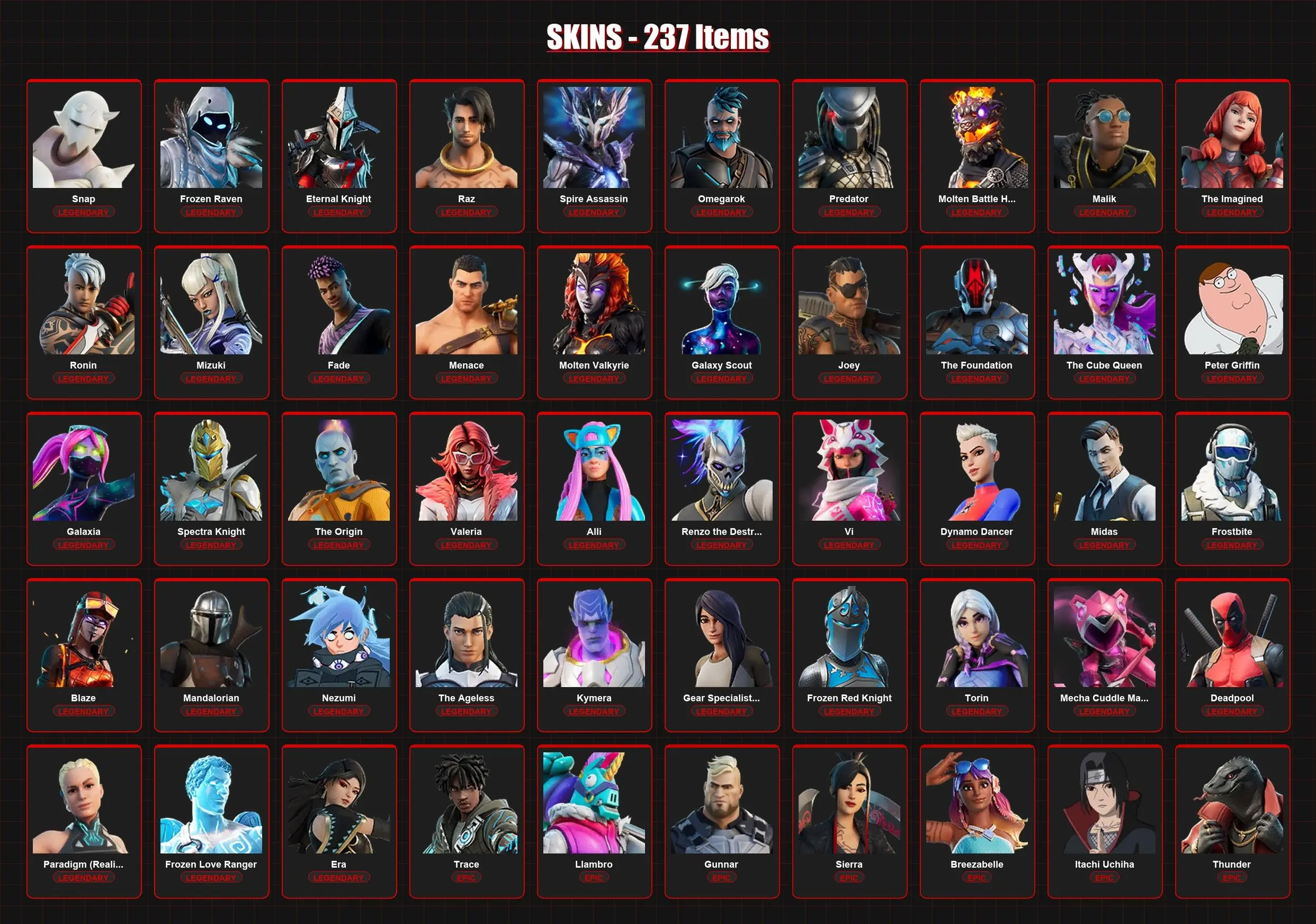 237 Skins | Snap | Frozen Raven | Eternal Knight | Raz | Spire Assassin | Omegarok | Predator | Molten Battle Hound | Malik | The Imagined | Lvl 3173