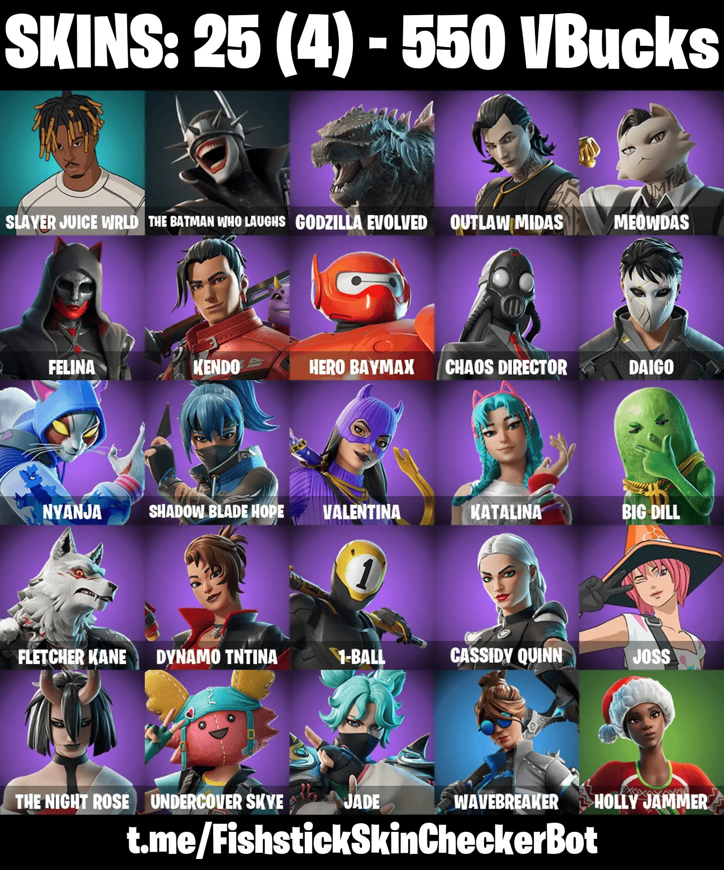 25 skins [PC/PSN/XBOX] 🎤 Slayer Juice WRLD 🃏 The Batman Who Laughs 🦖 Godzilla Evolved 🤠 Outlaw Midas 🐱 Meowdas 🐆 Felina 🗡️ Kendo 🤖 Hero Baymax 🚀 GCFN221