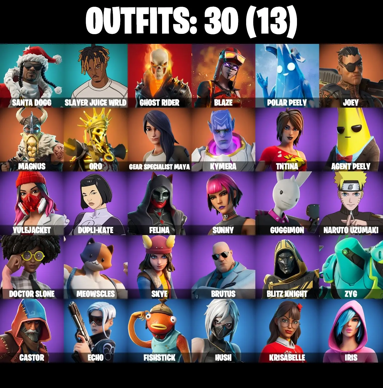30 SKINS | GHOST RIDER | NARUTO | MAYA | DUPLI-KATE | AGENT PEELY | SKYE | FISHSTICK | ORO | MAGNUS | STARLIT | CAN PLAY ON PSN,XBOX,PC,NINTENDO,MOBILE | 100 VBUCKS | FULL EMAIL ACCESS