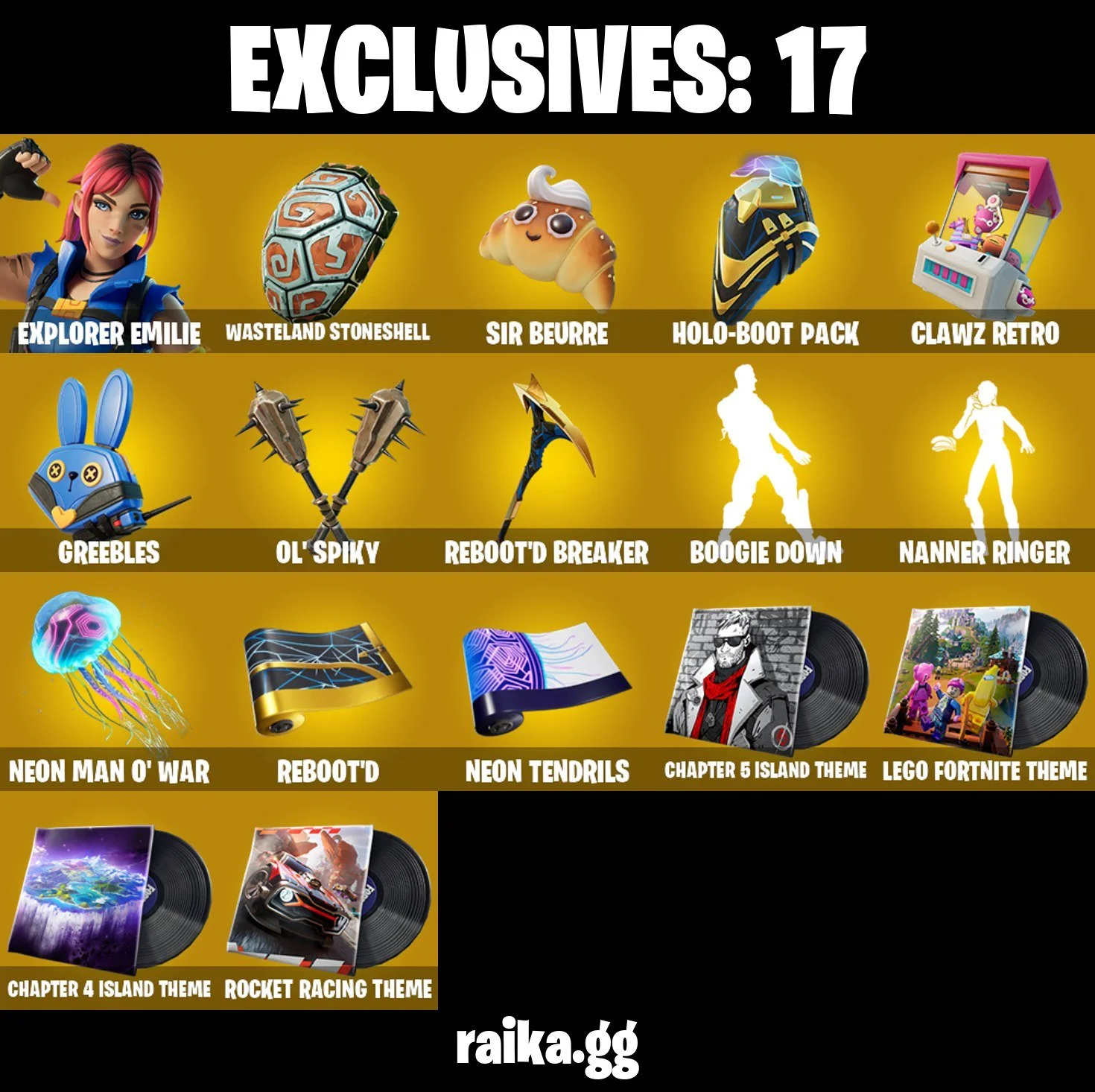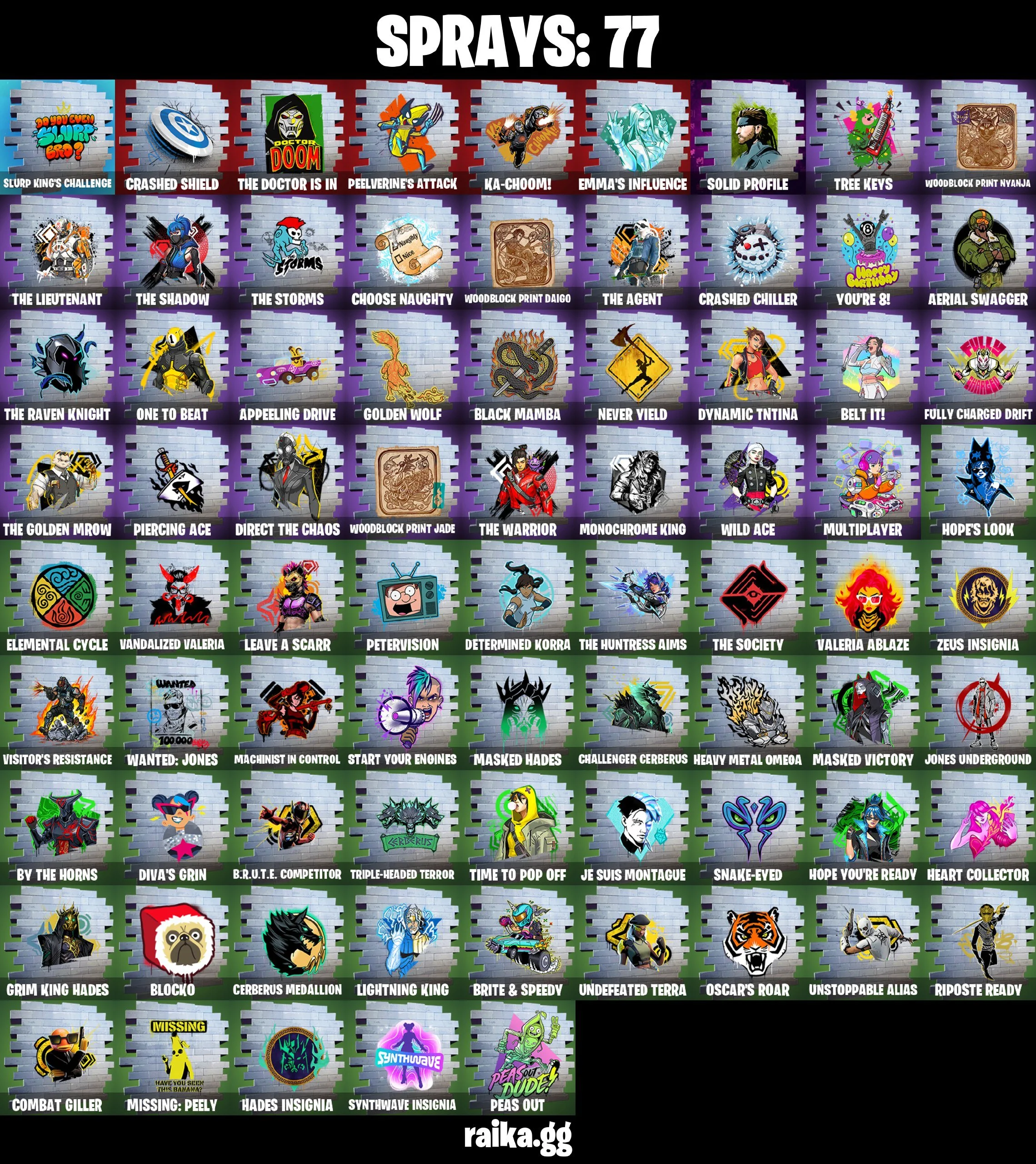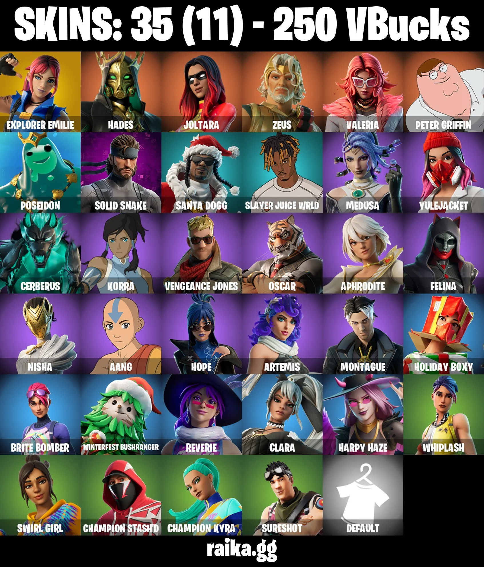 35 Skins đ§Ŧ Explorer Emilie đŋ Hades đą Joltara ⥠Zeus đŠī¸ Valeria đĄī¸ Peter Griffin đ Poseidon đ Solid Snake đ Santa Dogg đ§ Slayer Juice WRLD đ¤ OGmFN1019