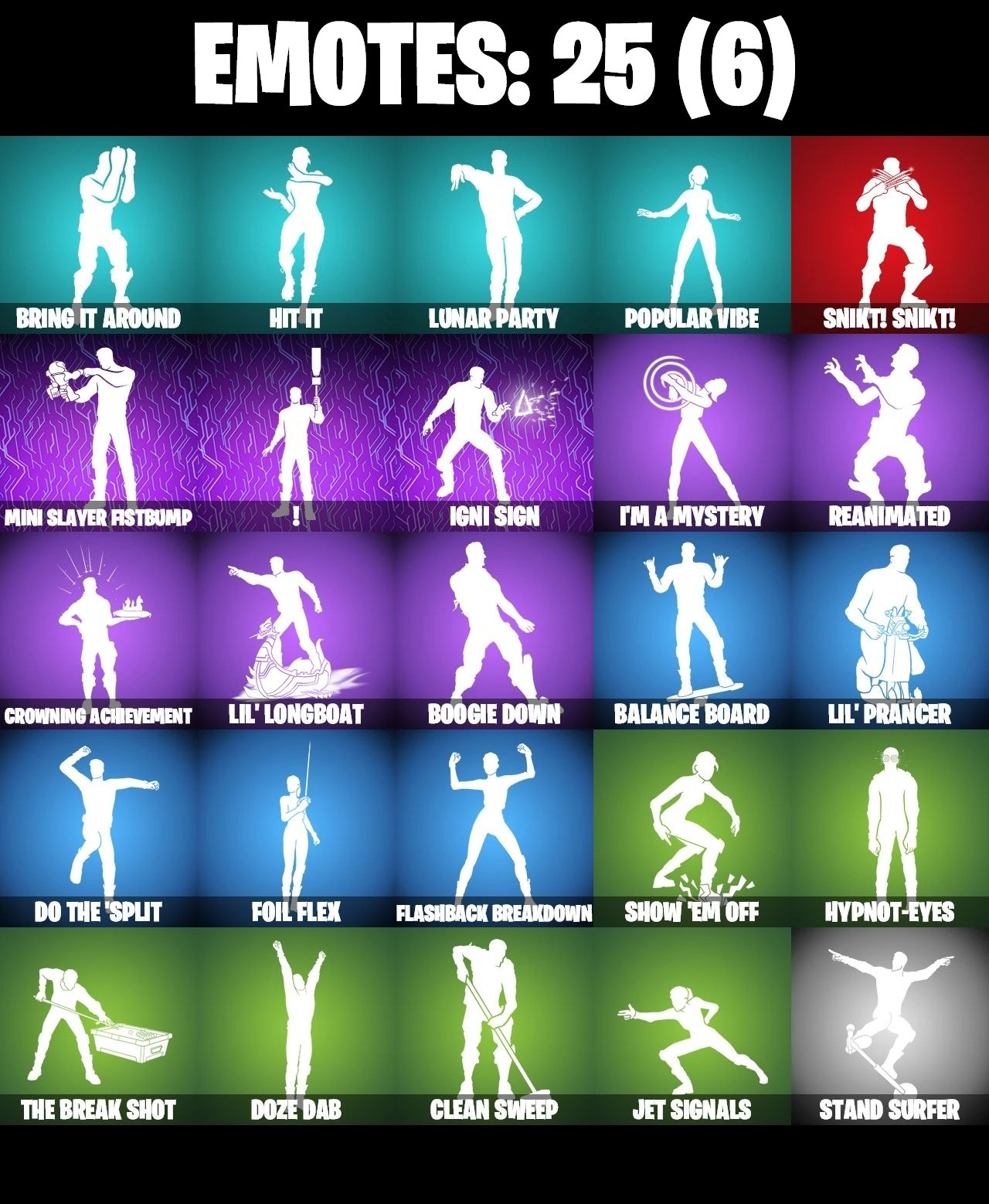 37 SKINS ⸱ DUSTY ⸱ HELSIE ⸱ LANA LLANE ⸱ SYLVIE ⸱ SUMMITSEEKER EVIE ⸱ SOLID SNAKE ⸱ NEZUMI ⸱ BLAZE ⸱ RAPSCALLION ⸱ SKULL SCOUT ⸱ SLIM SHADY ⸱ MANIC ⸱ MASSAI ⸱ LIL SPLIT ⸱ AURA ⸱ VISION ⸱ STUN KNIFE ⸱ POPULAR VIBE ⸱ BRING IT AROUND