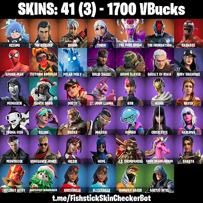 41 skins [PC/PSN/XBOX] 🌀 Nezumi 🔥 The Ageless 🌀 Ronin 👑 The Cube Queen 🛡️ The Foundation 🩸 Carnage 🕸️ Spider-Man 🚀 AGCFN157