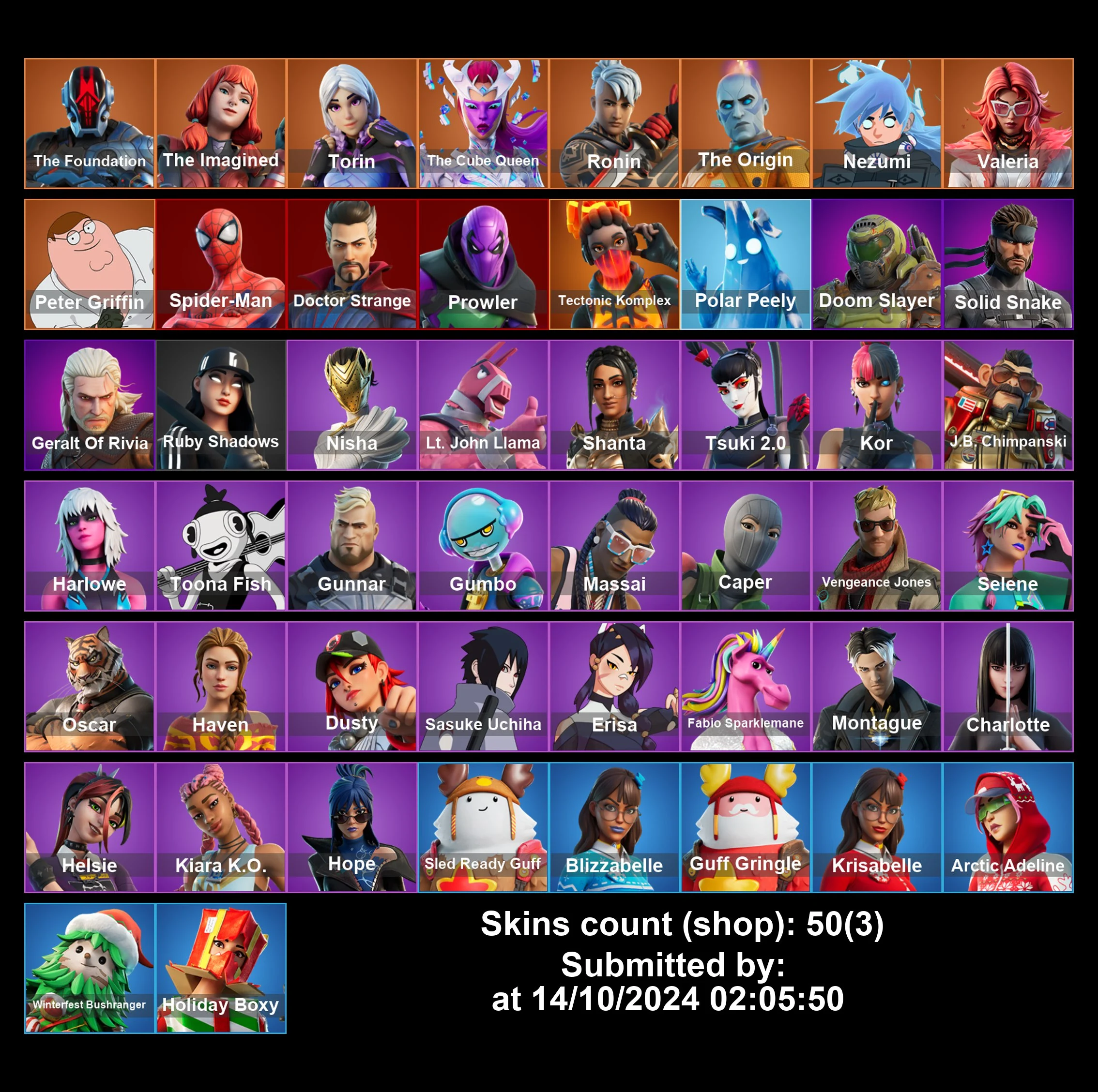 【50 SKINS】 (PC) SASUKE UCHIHA | SPIDER-MAN | GERALT OF RIVIA | THE FOUNDATION | THE IMAGINED | TORIN | THE CUBE QUEEN | RONIN | THE ORIGIN | NEZUMI | VALERIA | PETER GRIFFIN | DOCTOR STRANGE | PROWLER | TECTONIC KOMPLEX | POLAR PEELY | DOOM SLAYER