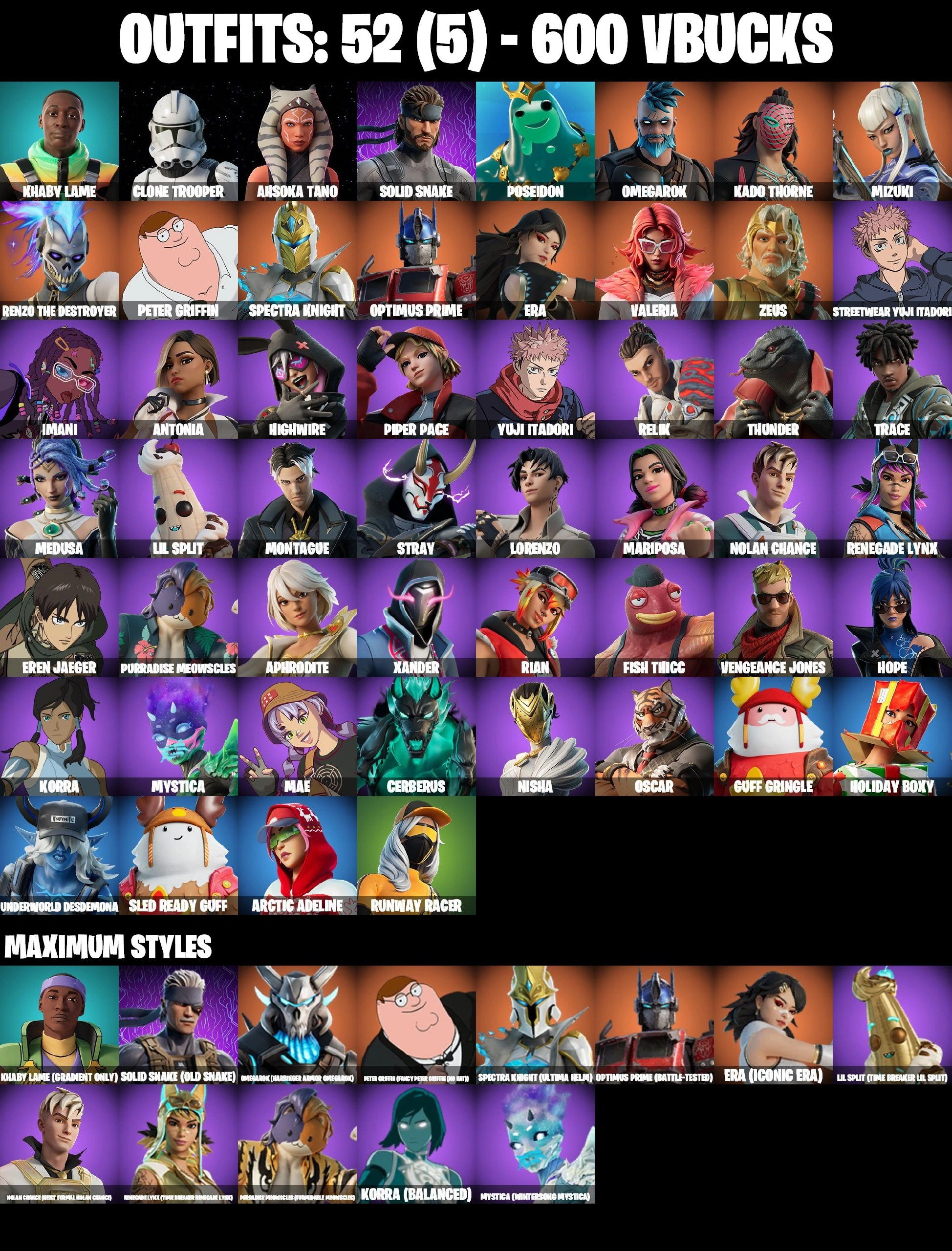 ❤️ 52 SKINS ❤️ YUJI ITADORI ❤️ STREETWEAR YUJI ITADORI ❤️ CLONE TROOPER ❤️ AHSOKA TANO ❤️ GET GRIDDY ❤️ EREN JAEGER ❤️ ERA MAX ❤️ MYSTICA MAX ❤️ MARIPOSA ❤️ MEDUSA ❤️ HOPE ❤️ CAN PLAY ON PSN ❤️ XBOX ❤️ PC ❤️ NINTENDO ❤️ MOBILE ❤️
