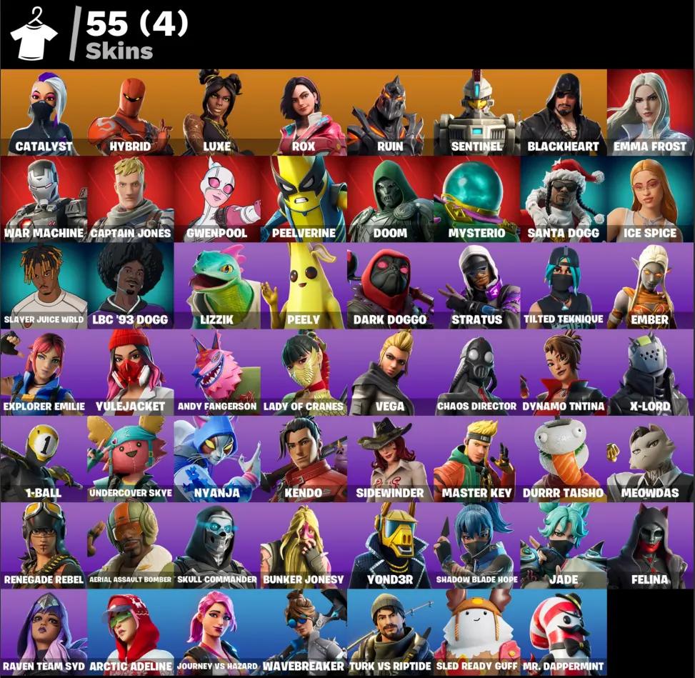 55 Skins ⸱ For all platforms, Hot Marat | Catalyst | Hybrid | Luxe Gold | Rox | Ruin | Sentinel | Blackheart | Emma Frost | War Machine | Captain Jones | Gwenpool | Peelverine