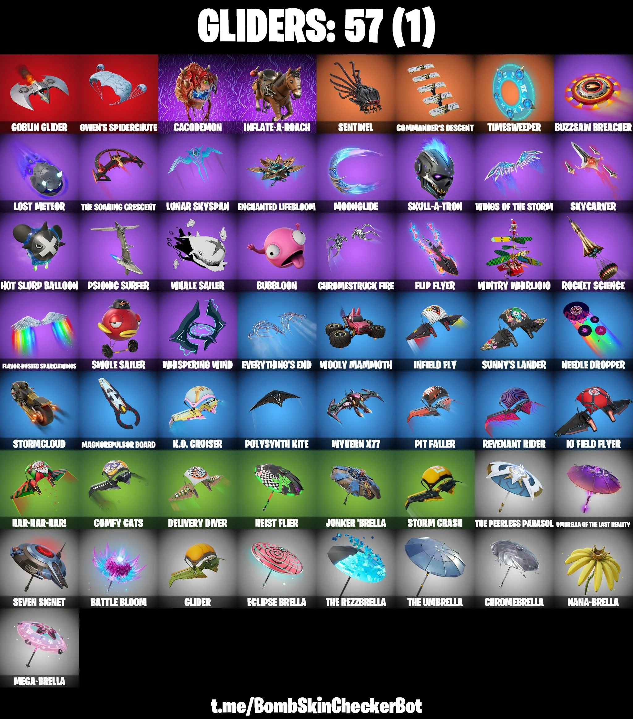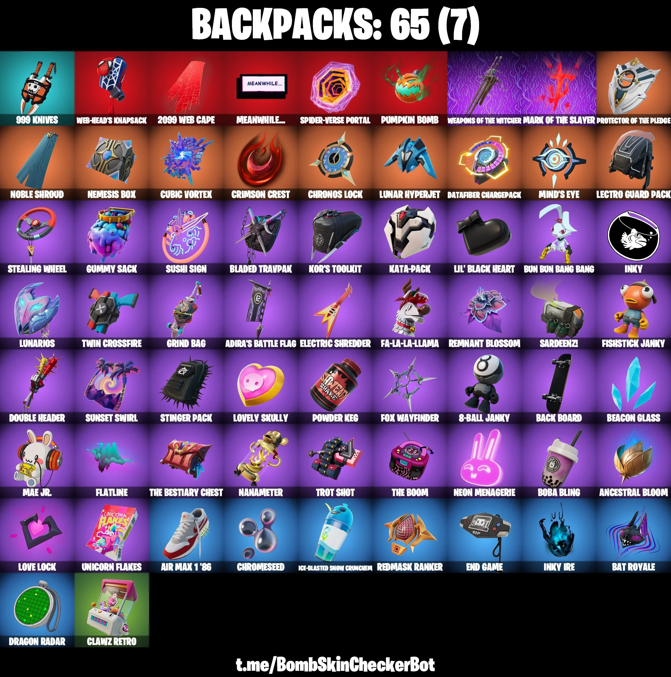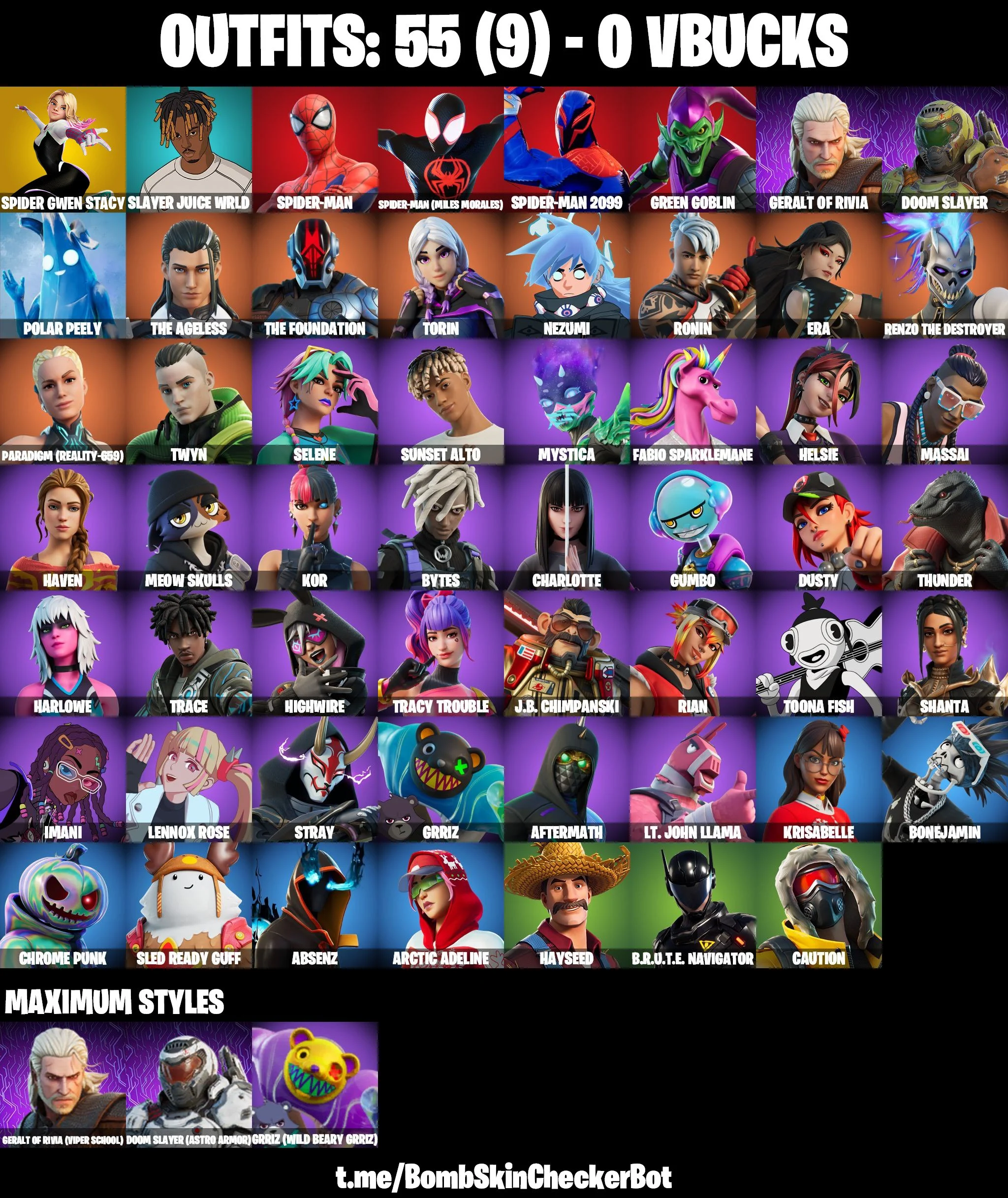 🔮55 Skins🔮 Spidergwen (Stacy)💎Polar Peely💎Krisabelle💎Toona Fish💎Meow Skulls💎Spiderman (Miles Morales)💎Spiderman 2099💎Spiderman💎Doom Slayer💎Geralt Of Rivia💎Slayer Juice Wrld💎Arctic Adeline💎Sled Ready Guff