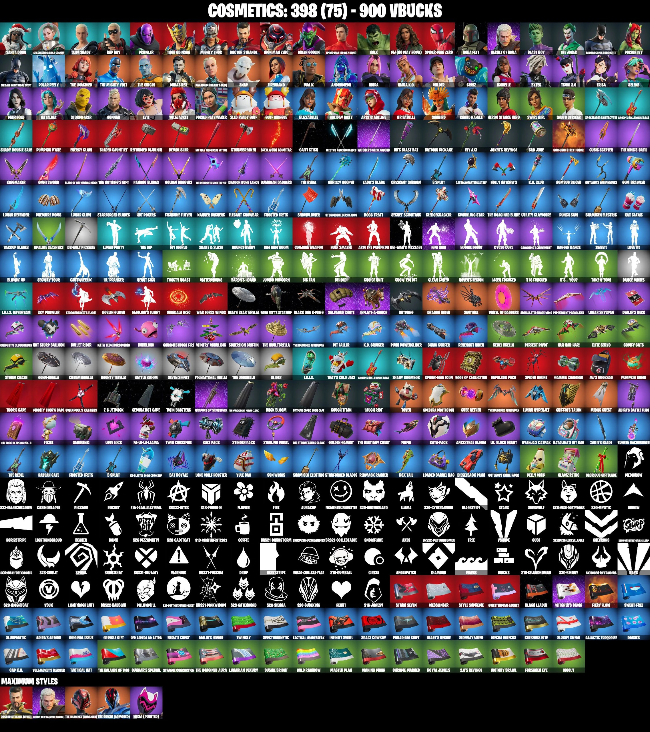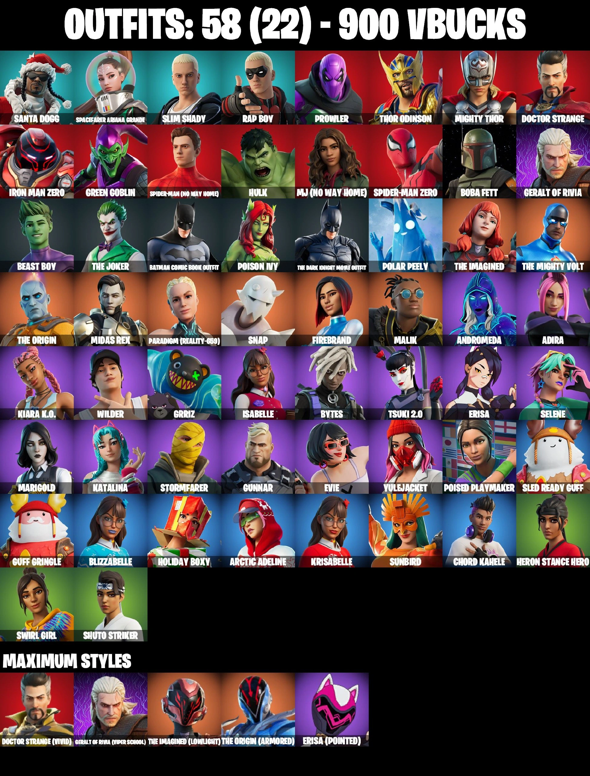 ❤️ 58 SKINS ❤️ FIREBRAND ❤️ SPIDER-MAN NO WAY HOME ❤️ MJ ❤️ SPIDER-MAN ZERO ❤️ BOBA FETT ❤️ POISON IVY ❤️ TSUKI 2.0 ❤️ EVIE ❤️ POISED PLAYMAKER ❤️ CAN PLAY ON PSN ❤️ XBOX ❤️ PC ❤️ NINTENDO ❤️ MOBILE ❤️ 900 VBUCKS ❤️