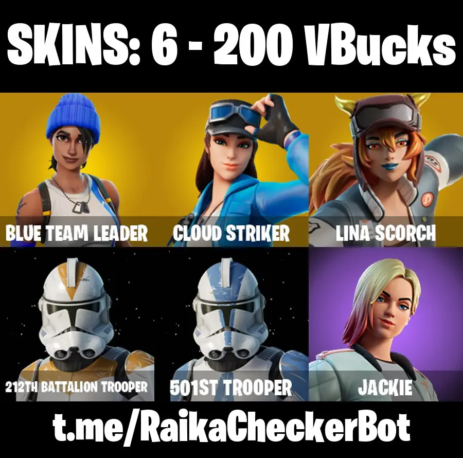 👑6 Skins 👑PC/PSN/XBOX👑 Blue Team Leader 👑 Cloud Striker 👑 Lina Scorch 👑 212th Battalion Trooper 👑 501st Trooper 👑 Jackie 👑 Nemesis Box 👑