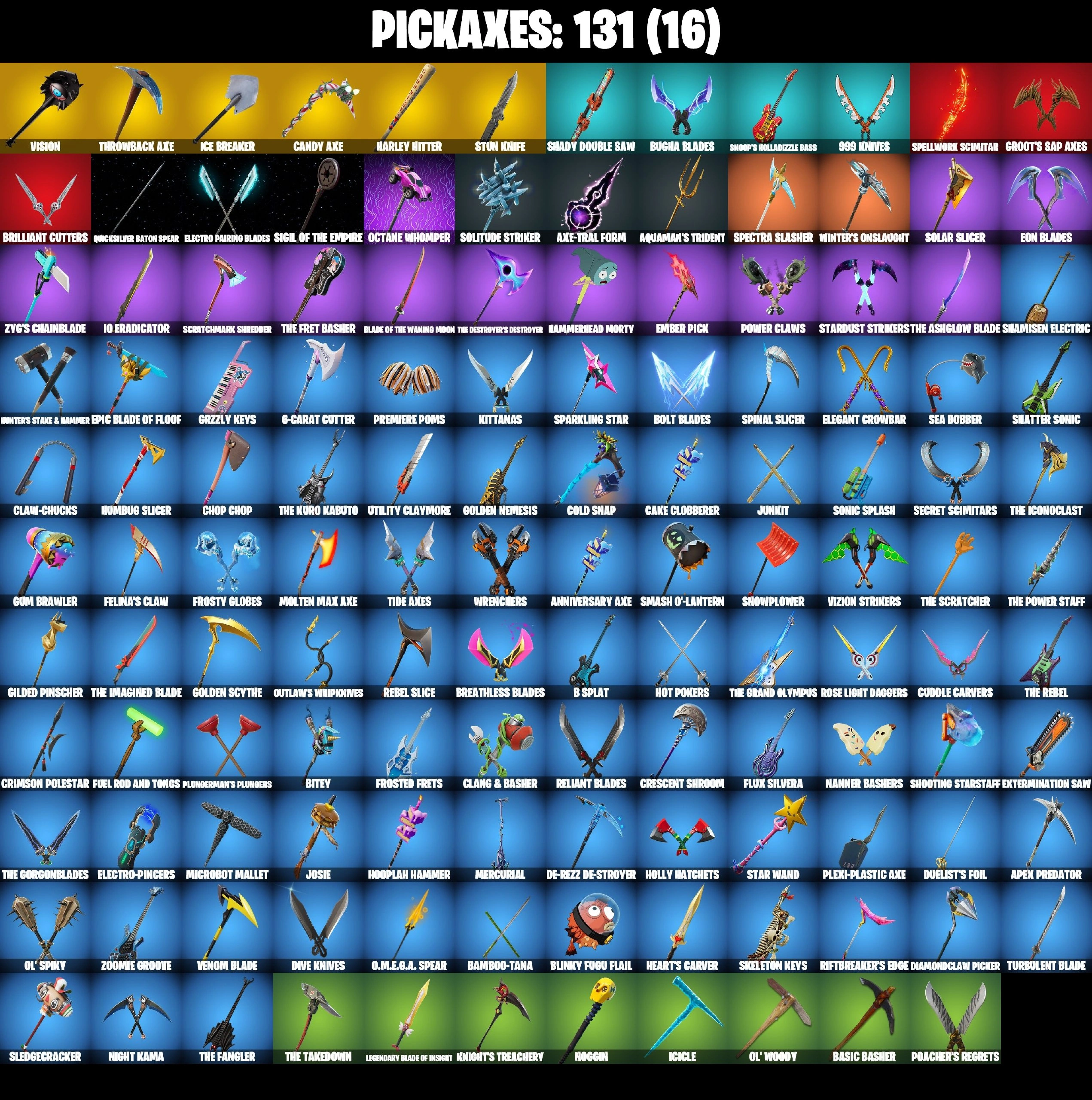 61 SKINS ⸱ LAUGH IT UP ⸱ ZERO ⸱ PLUNGERMAN ⸱ FADE ⸱ BACKLASH ⸱ SLUMBER ⸱ DIAMOND DIVA ⸱ GALAXY SCOUT ⸱ CATWOMAN COMIC BOOK OUTFIT ⸱ POLAR PEELY ⸱ BUGHA ⸱ POWERHOUSE ⸱ JULES ⸱ RICK SANCHEZ ⸱ KIT ⸱ DUMMY ⸱ ISO ⸱ KYMERA ⸱ STAR WAND -