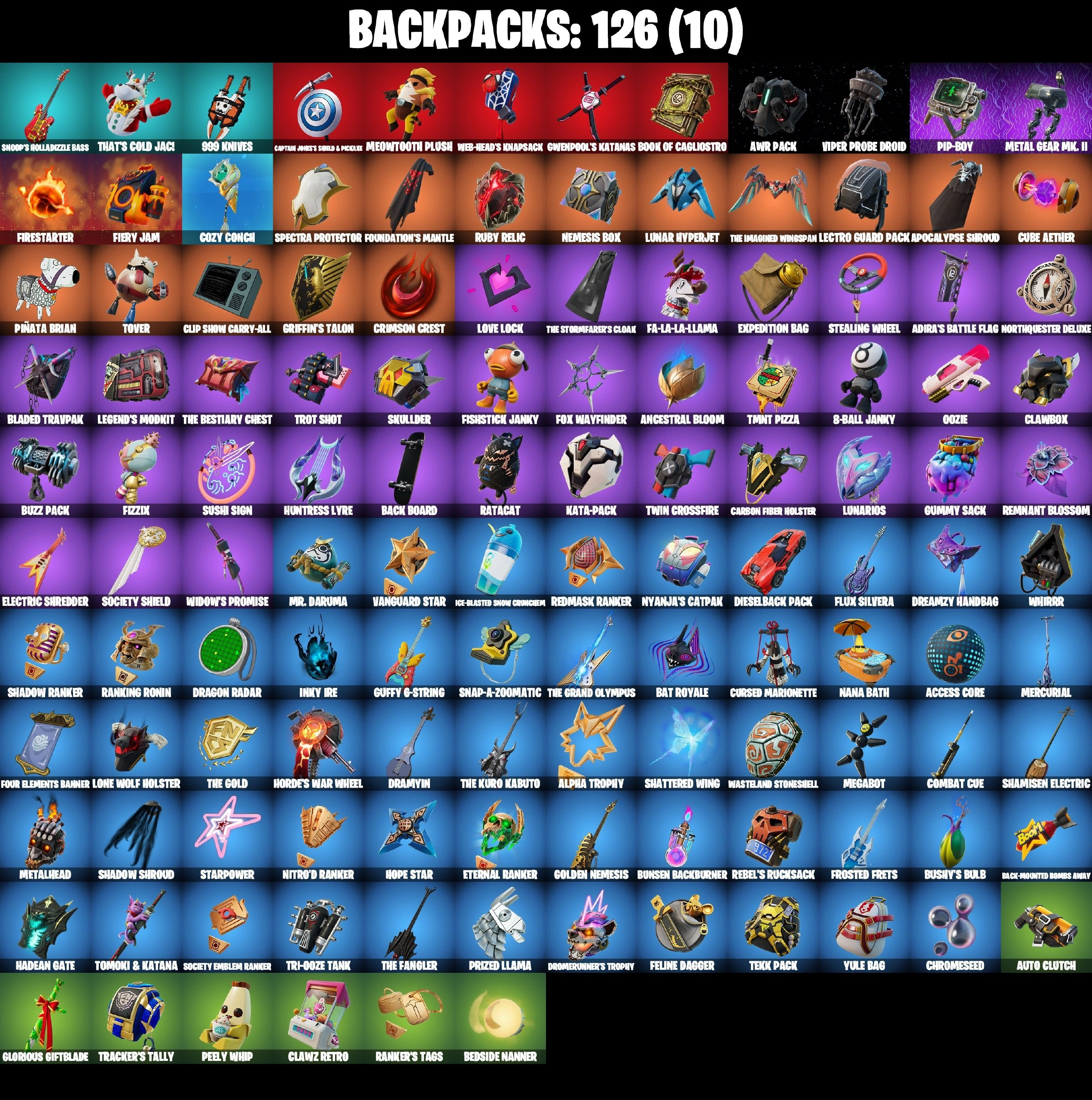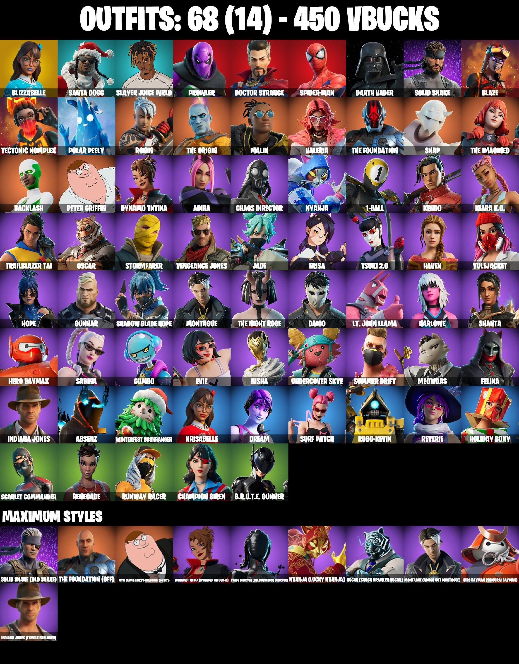 68 SKINS ⸱ SPIDER-MAN ⸱ BACKLASH ⸱ EVIE ⸱ DARTH VADER ⸱ PETER GRIFFIN ⸱ POLAR PEELY ⸱ SNAP ⸱ BLAZE ⸱ SOLID SNAKE ⸱ PROWLER ⸱ MEOWDAS ⸱ SURF WITCH ⸱ DREAM ⸱ POLAR PEELY ⸱ ROBO-KEVIN ⸱ JADE ⸱ GUMBO ⸱ HARLEY HITTER ⸱ COLD SNAP ⸱ DRIV