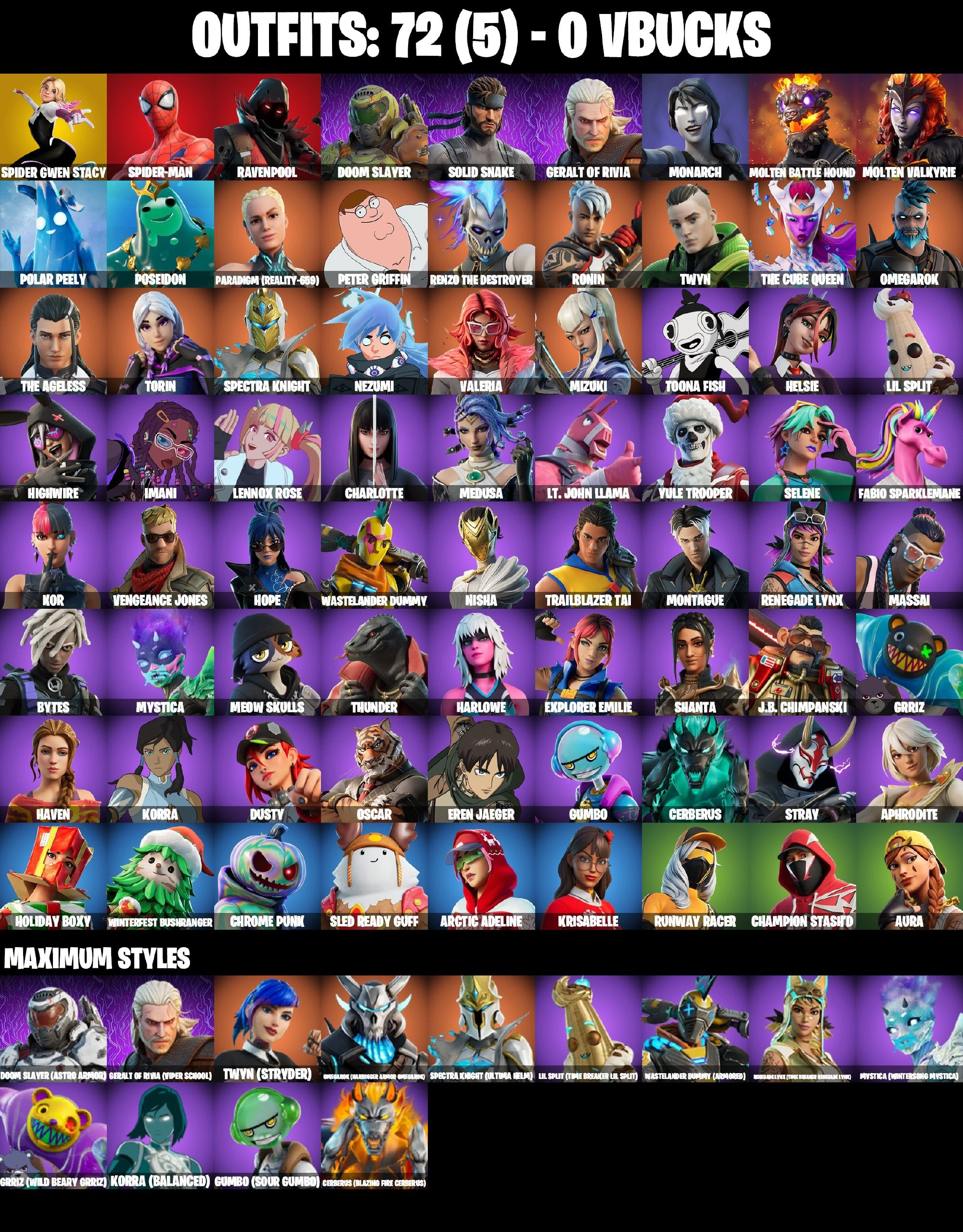 72 SKINS | YULE TROOPER | RAVENPOOL | SPIDER-GWEN STACY | SPIDER-MAN | GET GRIDDY | EREN JAEGER | MYSTICA MAX | HELSIE | CHARLOTTE | KOR | AURA | MEOW SKULLS | ASTROWORLD CYCLONE | CAN PLAY ON PSN,XBOX,PC,NINTENDO,MOBILE | 0 VBUCK