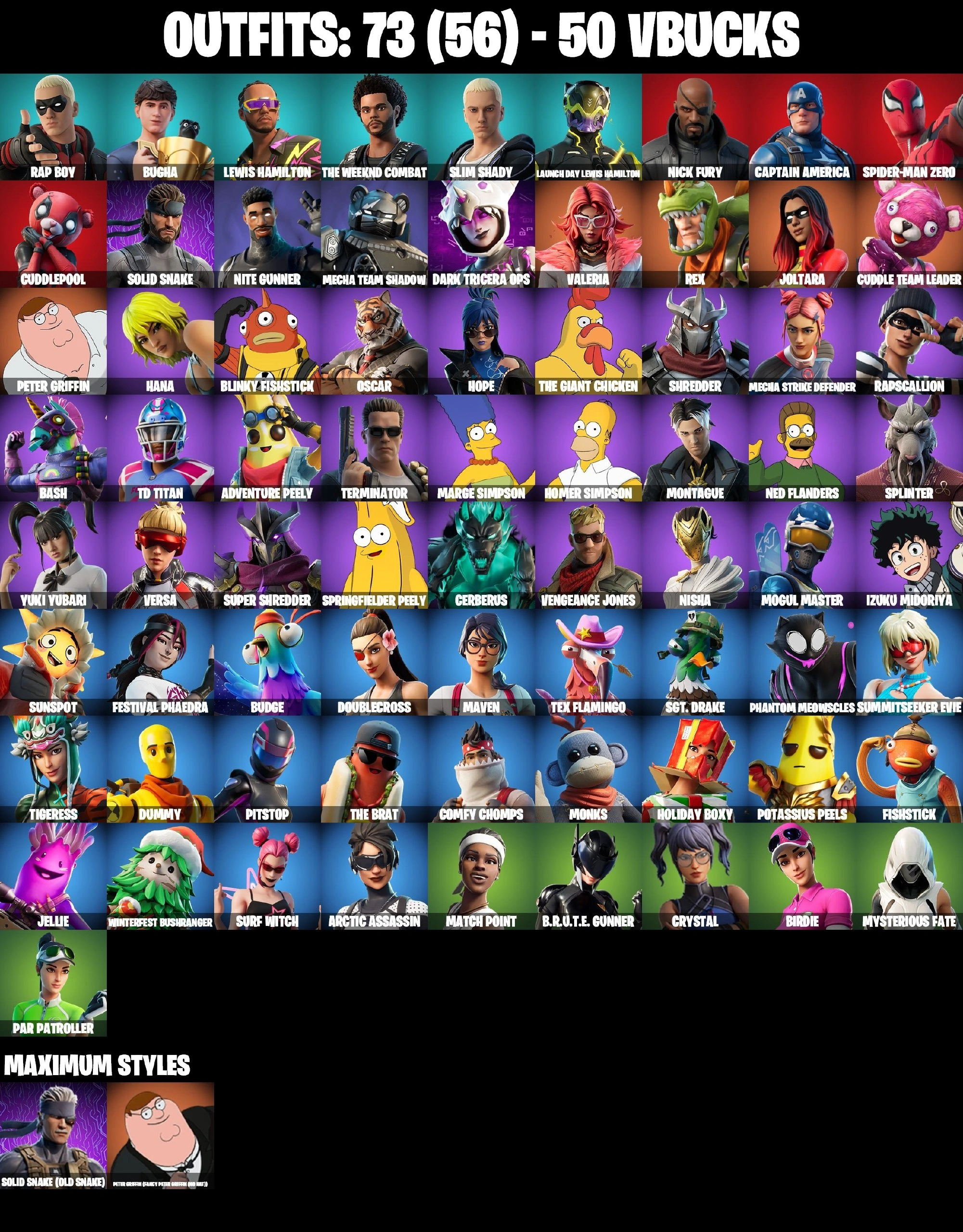73 SKINS ⸱ LEWIS HAMILTON ⸱ TERMINATOR ⸱ HOMER SIMPSON ⸱ SPRINGFIELDER PEELY ⸱ VERSA ⸱ MONKS ⸱ THE BRAT ⸱ DISHSTICK ⸱ CAPTAIN AMERICA ⸱ NICK FURY ⸱ BUDGE ⸱ NED FLANDERS ⸱ YUKI YUBARI ⸱ SPLINTER ⸱ SHREDDER ⸱ BASH ⸱ JOLTARA ⸱ VISION