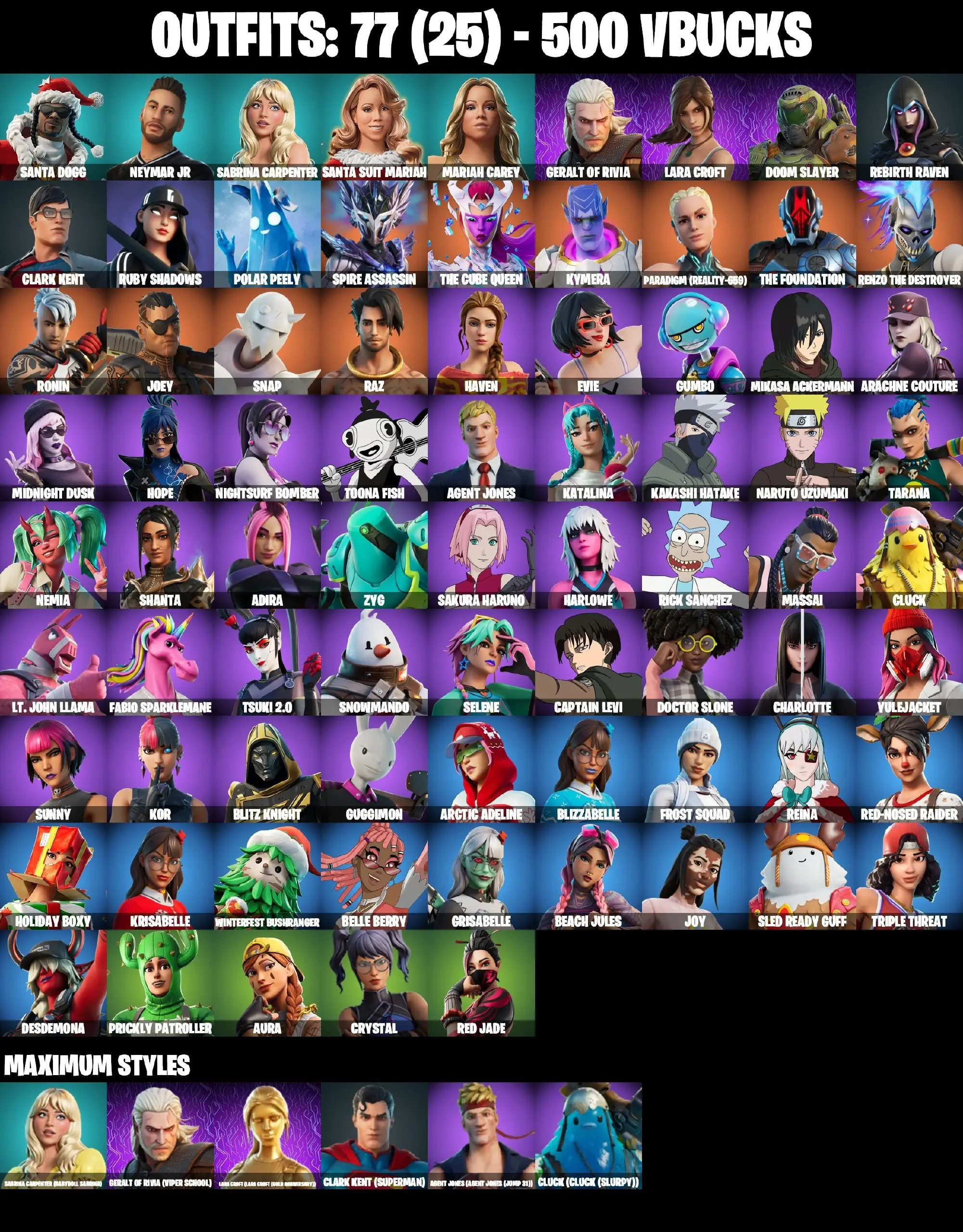 77 SKINS | CAPTAIN LEVI | MIKASA ACKERMANN | GOLDEN LARA CROFT | NARUTO | KAKASHI | SAKURA HARUNO | EVIE | TSUKI 2.0 | CHARLOTTE | KOR | AURA | BEACH JULES | CAN PLAY ON PSN,XBOX,PC,NINTENDO,MOBILE | 500 VBUCKS | FULL EMAIL ACCESS