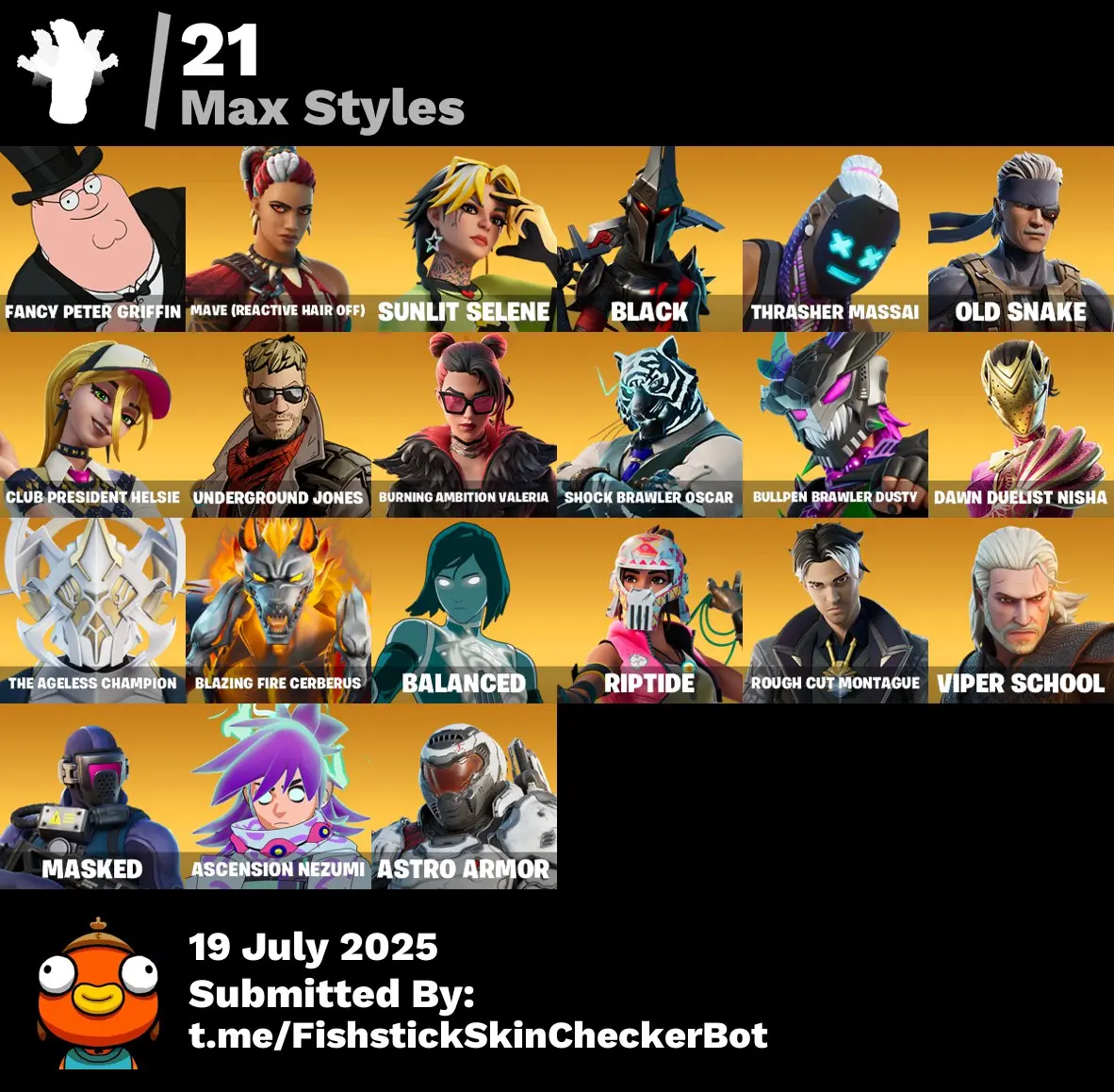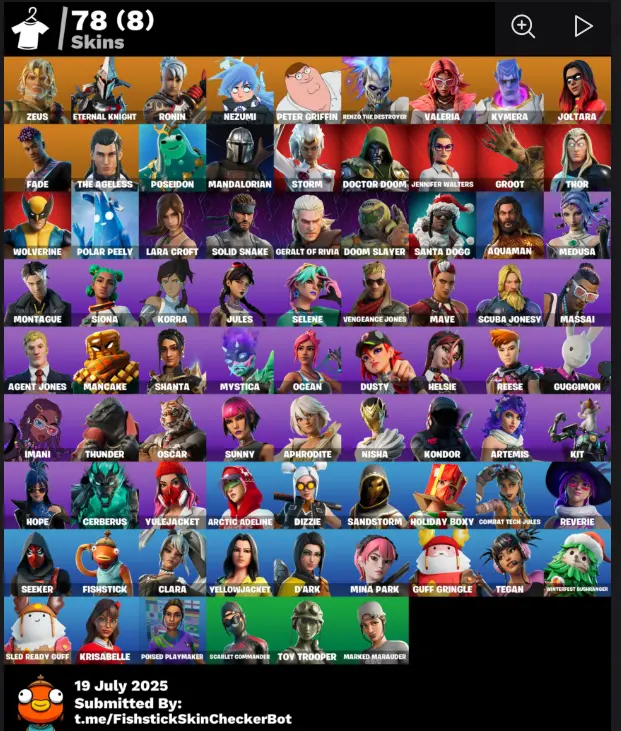 ๐ 78 Skins [PC/PSN] โก Zeus ๐ก๏ธ Eternal Knight โ๏ธ Ronin ๐ Nezumi ๐ Peter Griffin ๐ฅ Renzo the Destroyer ๐ซ Valeria ๐ช Kymera ๐ Joltara ๐ซ๏ธ Fade ๐ช FTN118