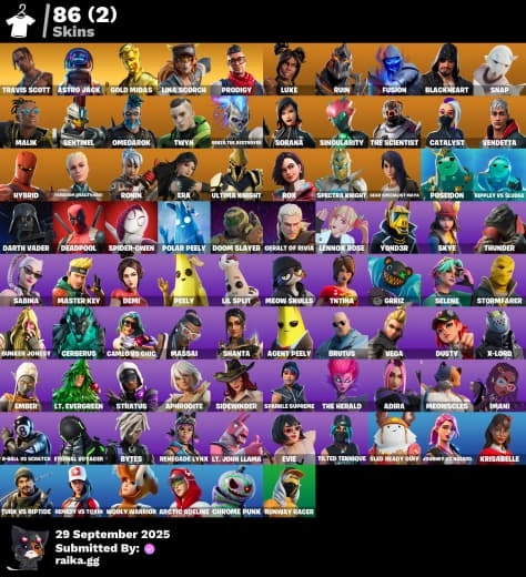86 skins | Travis Scott | Astro Jack | Astroworld Cyclone | Gold Midas | Take The Elf | Hot Marat | Spider-Gwen | Lina Scorch | Prodigy | Luxe | Ruin | Fusion | Blackheart | Snap | Malik | Sentinel | Omegarok | Twyn | Renzo the Destroyer | Sorana | A2905