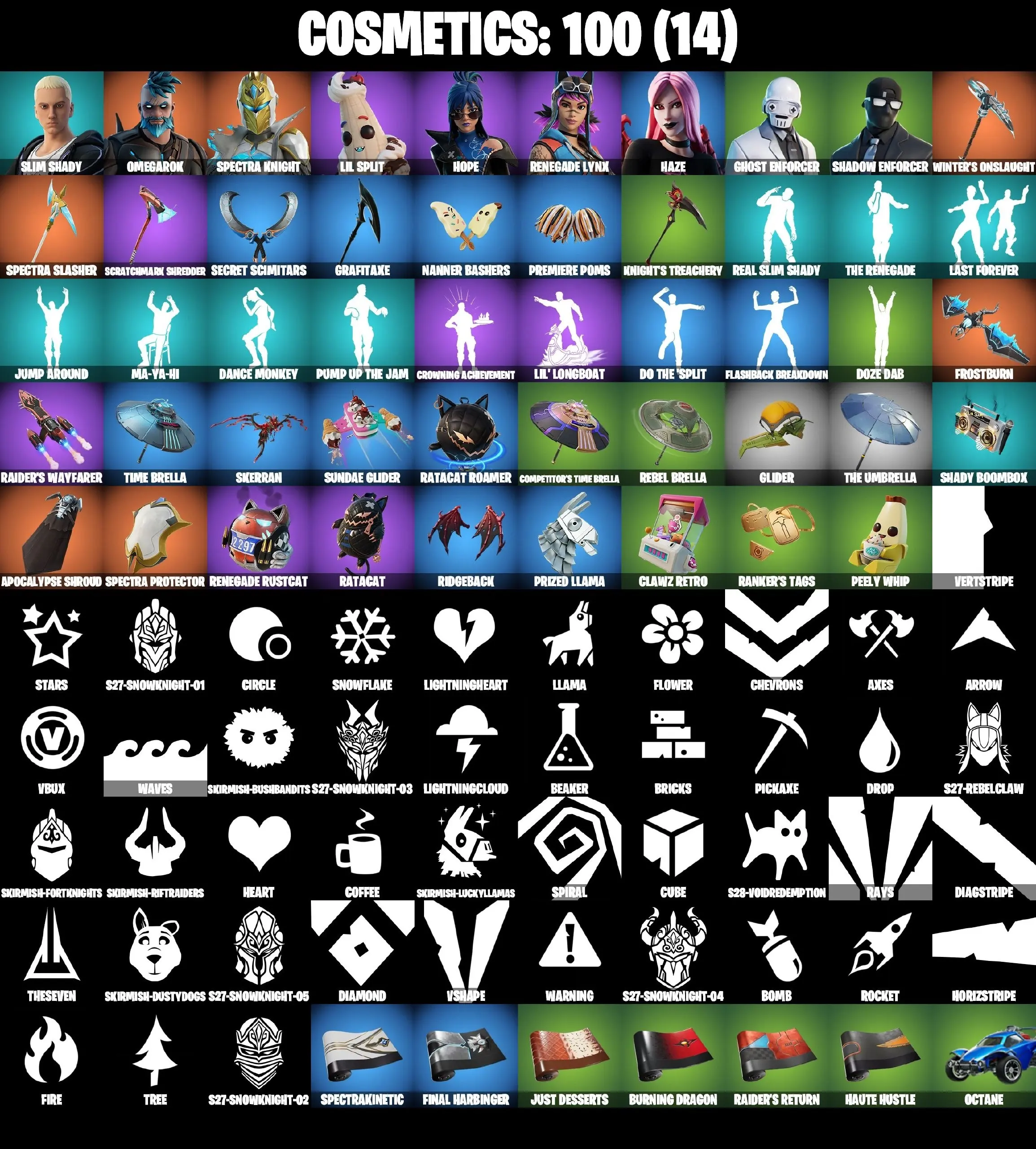 ❤️ 9 SKINS ❤️ 100 cosmetics ❤️ Slim Shady ❤️ Omegarok ❤️ Spectra Knight ❤️ Lil Split ❤️ Hope ❤️ Renegade Lynx ❤️ Haze ❤️ CAN PLAY ON PSN ❤️ XBOX ❤️ PC ❤️ NINTENDO ❤️ MOBILE ❤️
