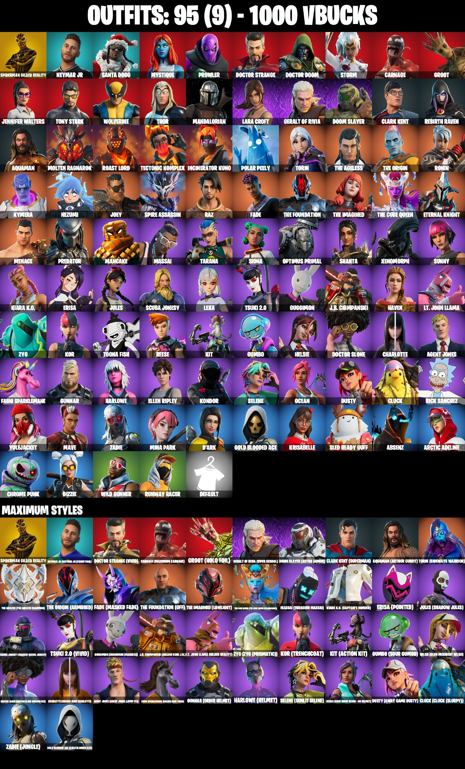 95 SKINS | LARA CROFT | HOLO FOIL GROOT | MANDALORIAN | GILDED SPIDER-MAN | MINA PARK | XENOMORPH | ELLEN RIPLEY | PREDATOR | CHARLOTTE MAX | KOR MAX | HELSIE MAX | JULES MAX | TSUKI 2.0 MAX | CAN PLAY ON PSN,XBOX,PC,NINTENDO,MOBI