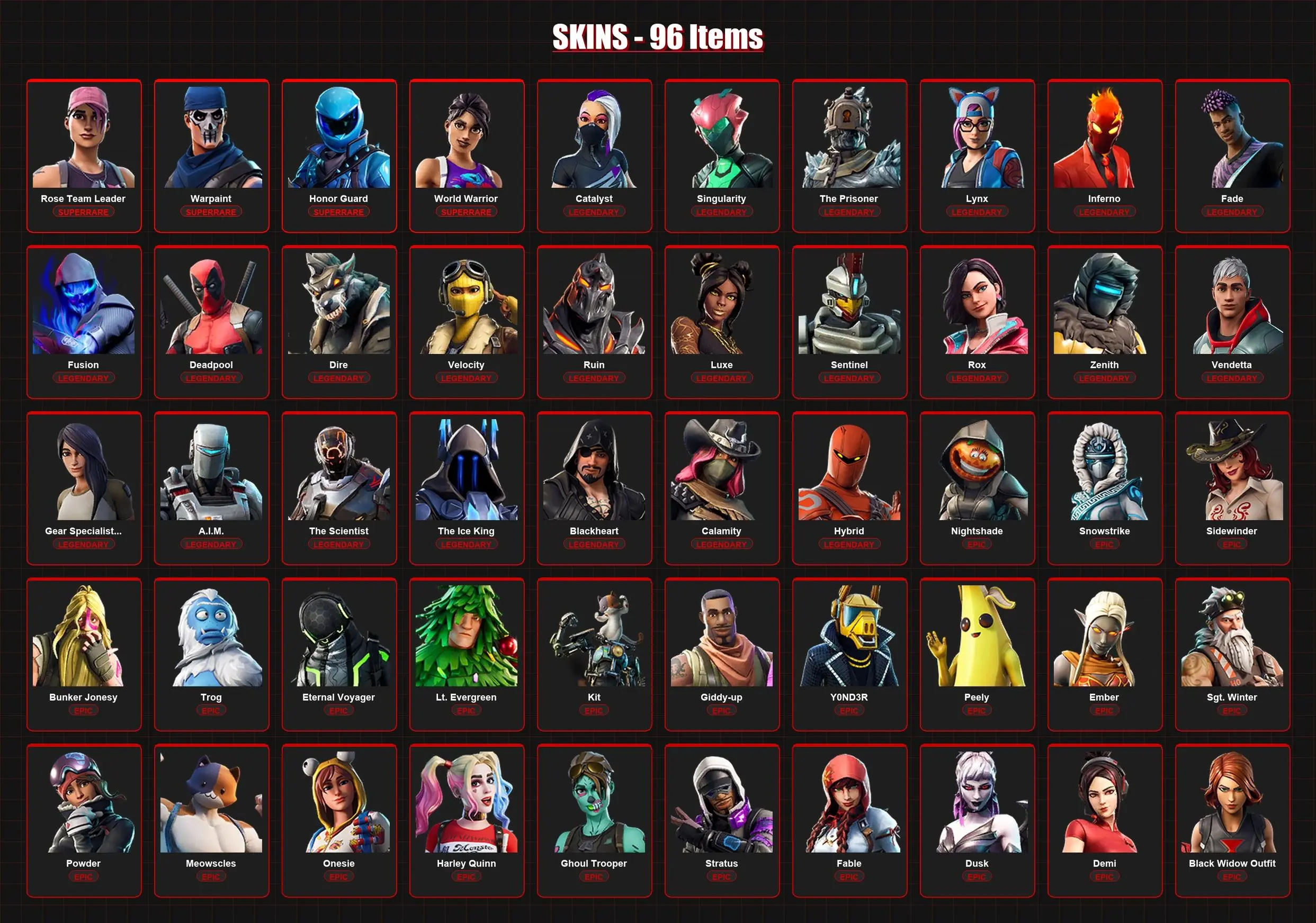 96 Skins | Rose Team Leader | Warpaint | Honor Guard | World Warrior | Catalyst | Singularity | The Prisoner | Lynx | Inferno | Fade | Lvl 748