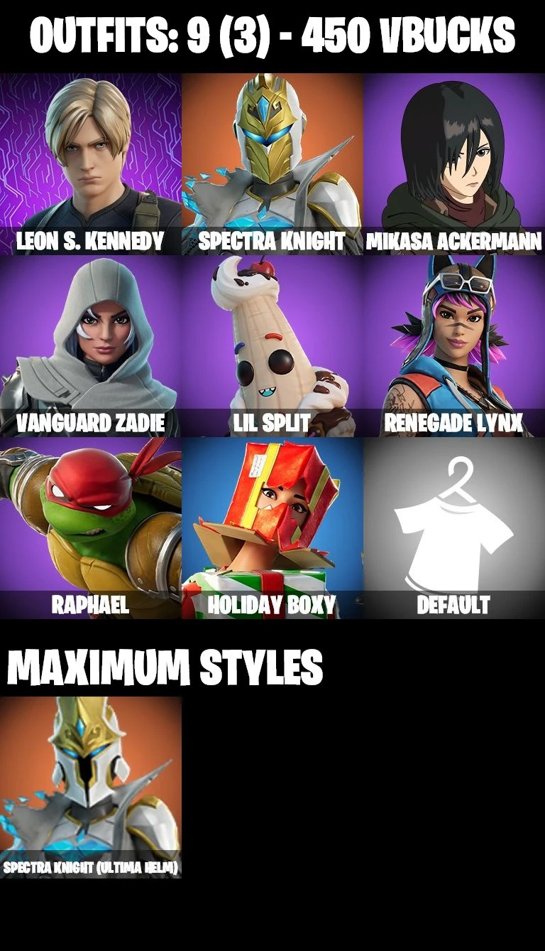 ALL PLATFORMS โก 9 SKINS ๐ MIKASA ACKERMANN ๐ RENEGADE LYNX ๐ LEON S. KENNEDY ๐ VVANGUARD ZADIE ๐ RAPHAEL โก FULL ACCESS