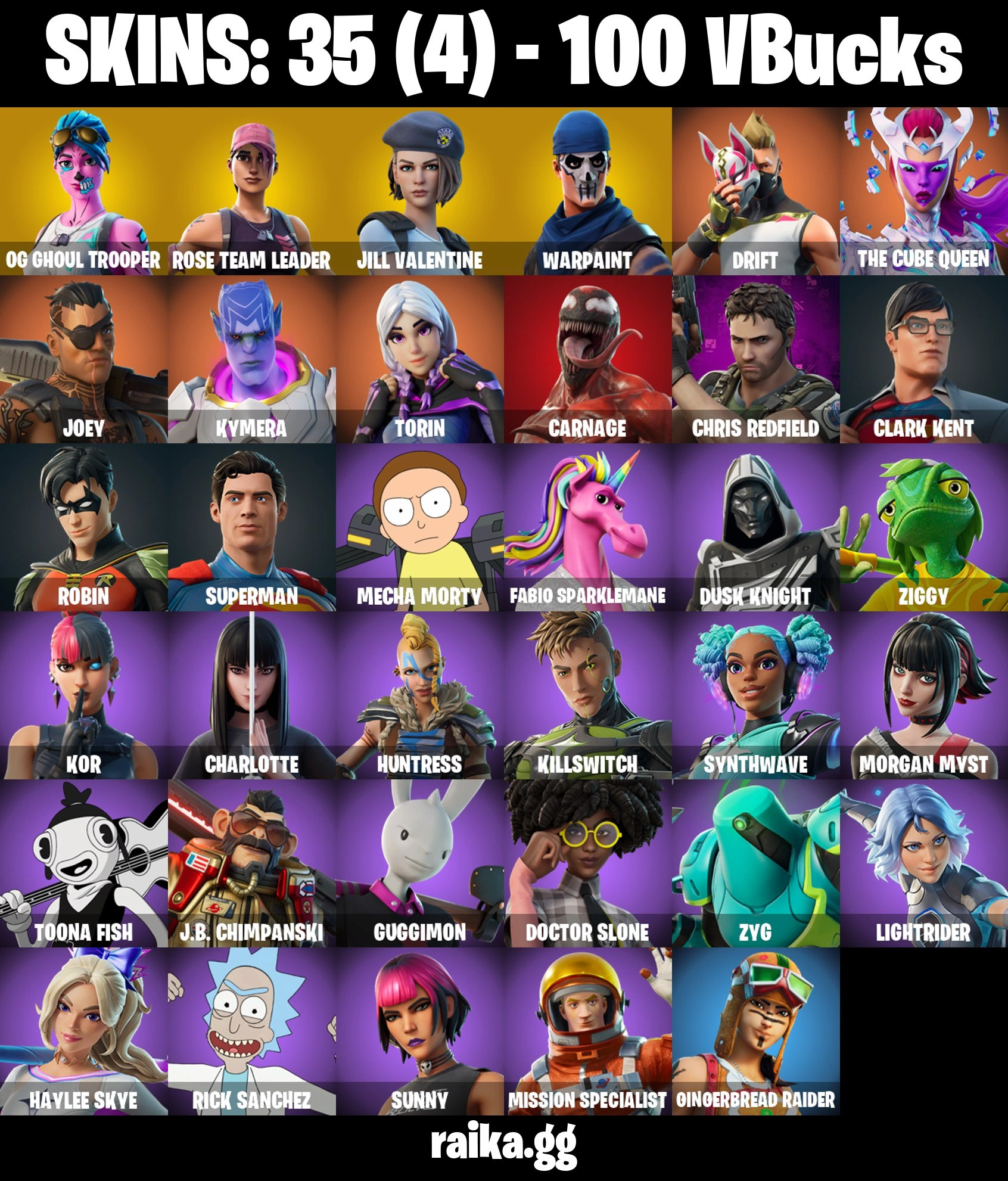 [ ALL PLATFORMS LINKABLE ] 35 skins 👑 Og Ghoul Trooper 🔥 OG STW ⚡ Jill Valentine ⚡ Drift ⚡ The Cube Queen ⚡ Joey | Kymera ⚡ Torin ☂️ Founders Umbrella 🪓 Reaper 🕺 Fresh