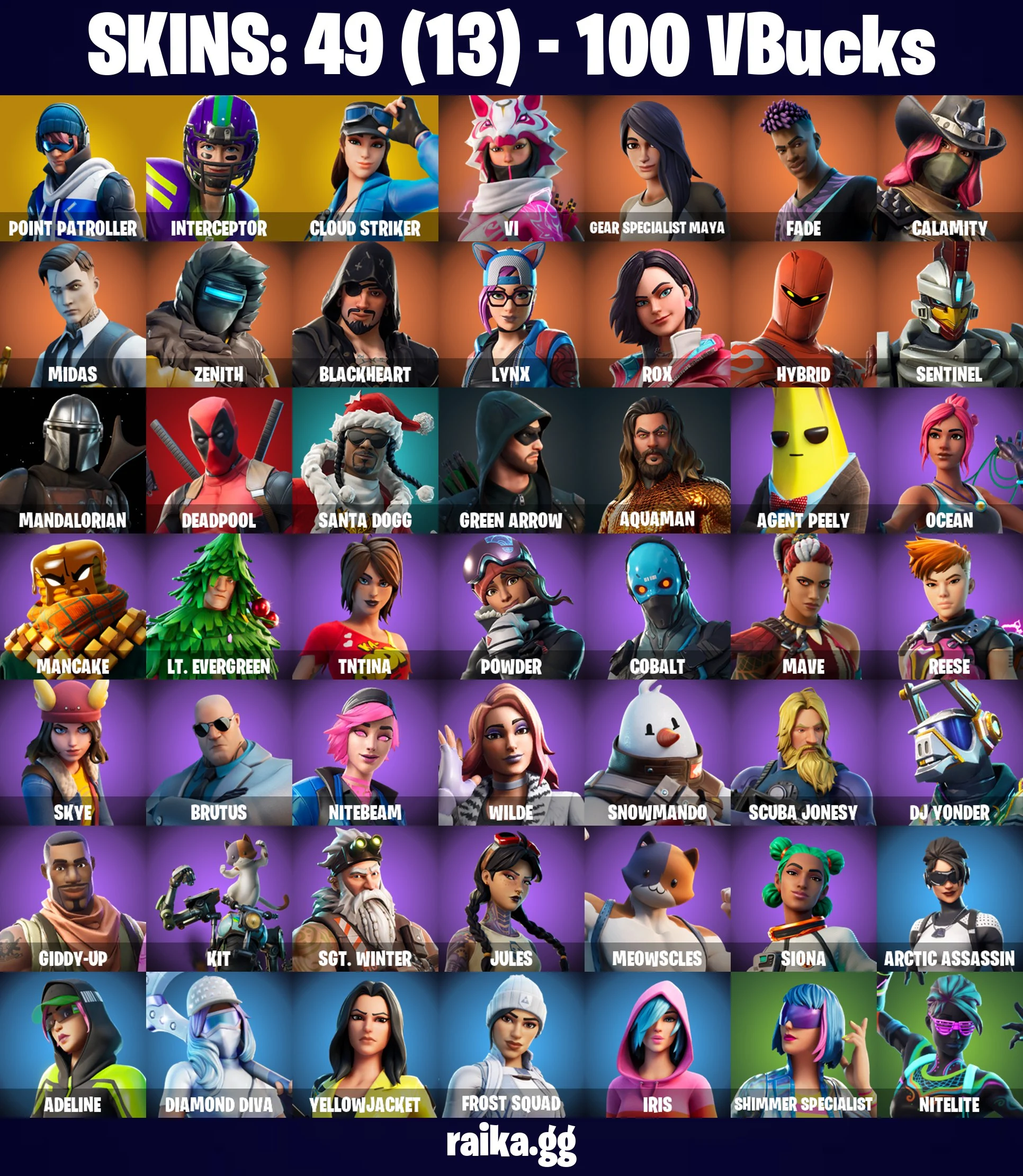 ๐ดโฆ๏ธ HQ OFFER โฆ๏ธ๐ด 49 skins ๐ Point Patroller ๐ Interceptor ๐ Cloud Striker ๐ Vi ๐ Gear Specialist Maya ๐ Fade ๐ Calamity ๐ Midas ๐ Zenith ๐ Blackheart ๐ Lynx ๐ Rox ๐ Hybrid ๐ Sentinel ๐ Mandalorian ๐ PC\PSN\XBOX\SWITCH ๐