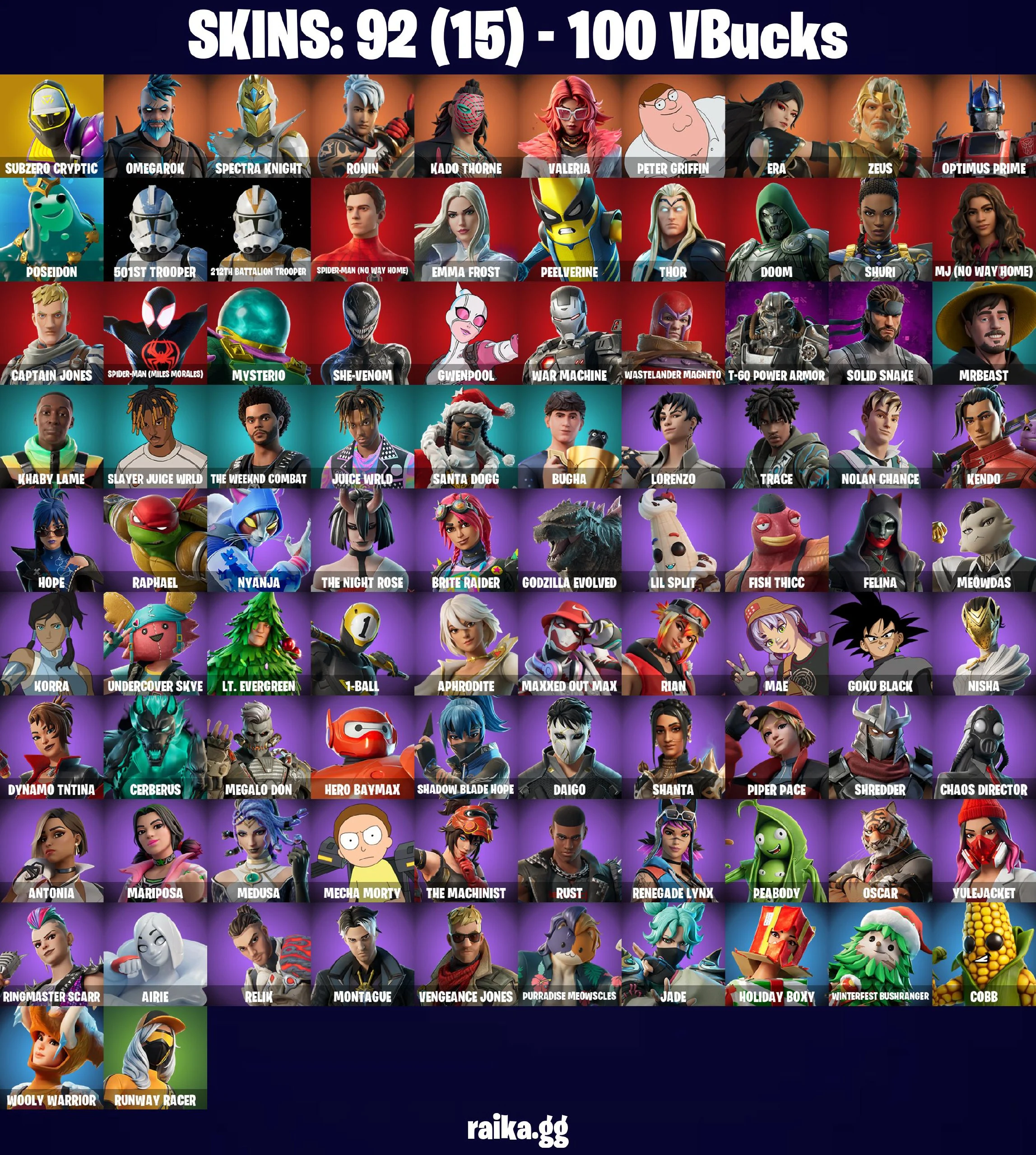 ๐ดโฆ๏ธ LIMITED OFFER โฆ๏ธ๐ด 92 skins ๐ Subzero Cryptic ๐ Omegarok ๐ Spectra Knight ๐ Ronin ๐ Kado Thorne ๐ Valeria ๐ Peter Griffin ๐ Era ๐ Zeus ๐ Optimus Prime ๐ Poseidon ๐ 501st Trooper ๐ PC\PSN\XBOX\SWITCH ๐